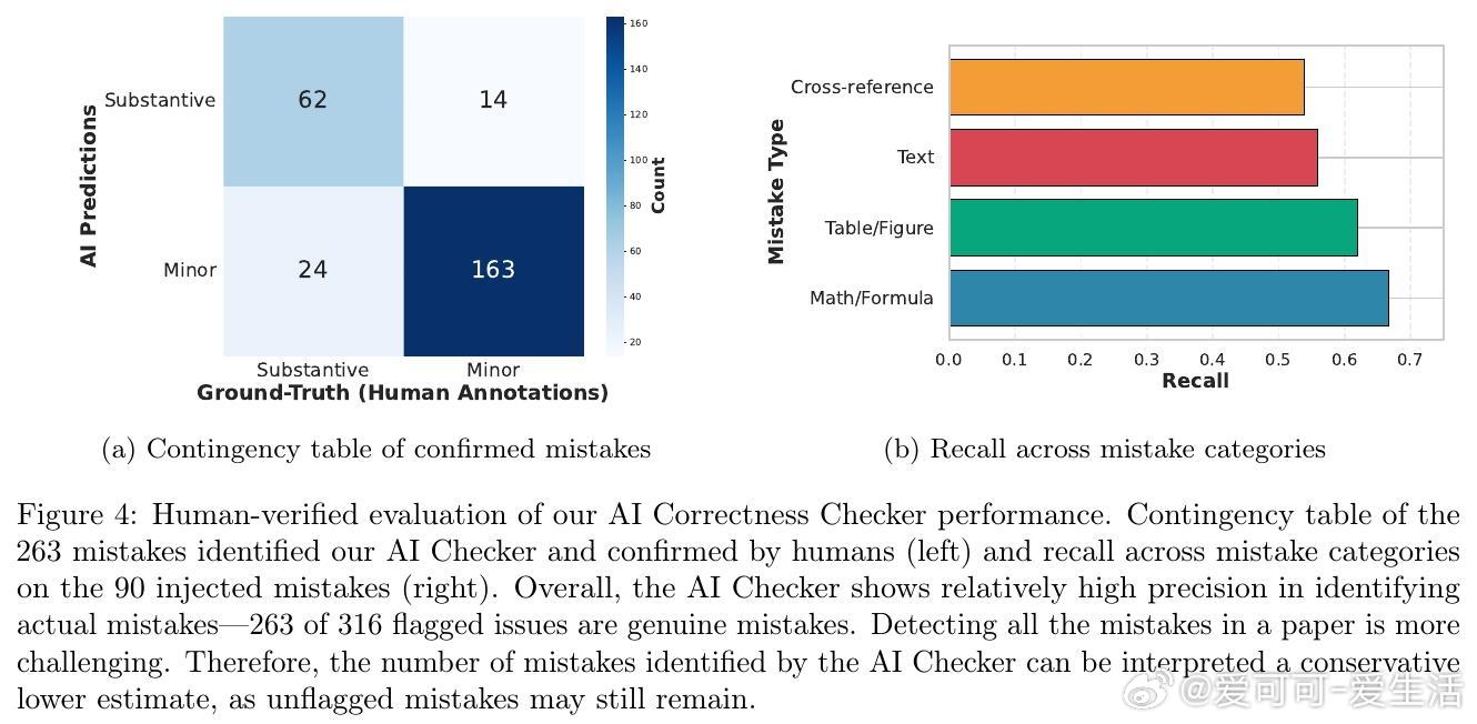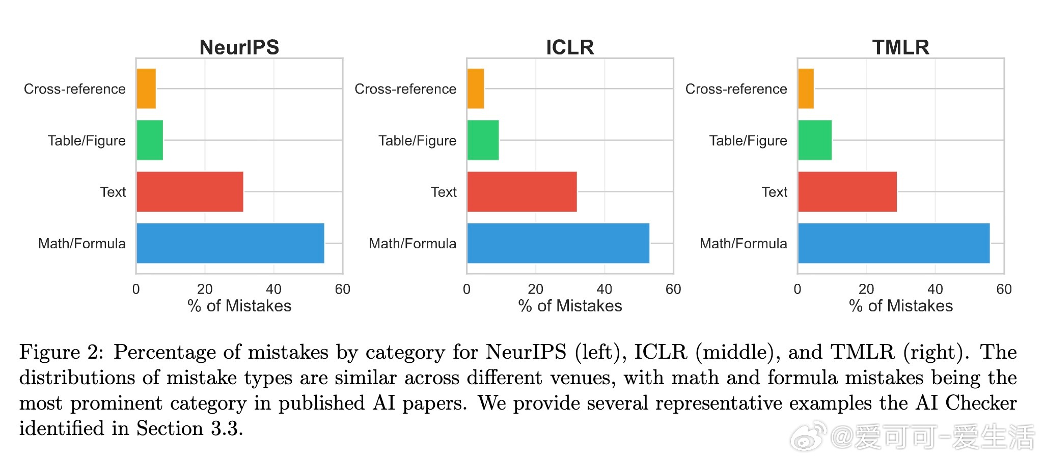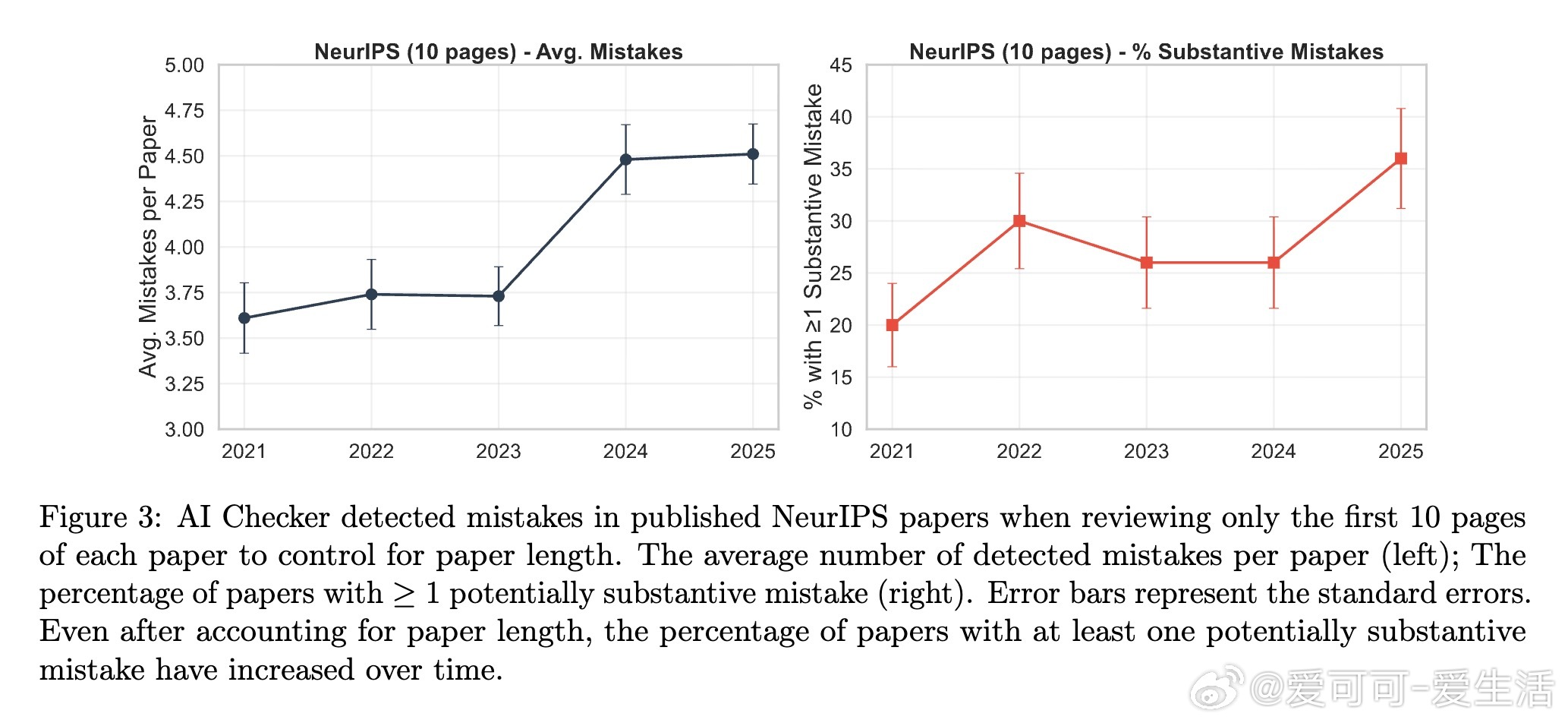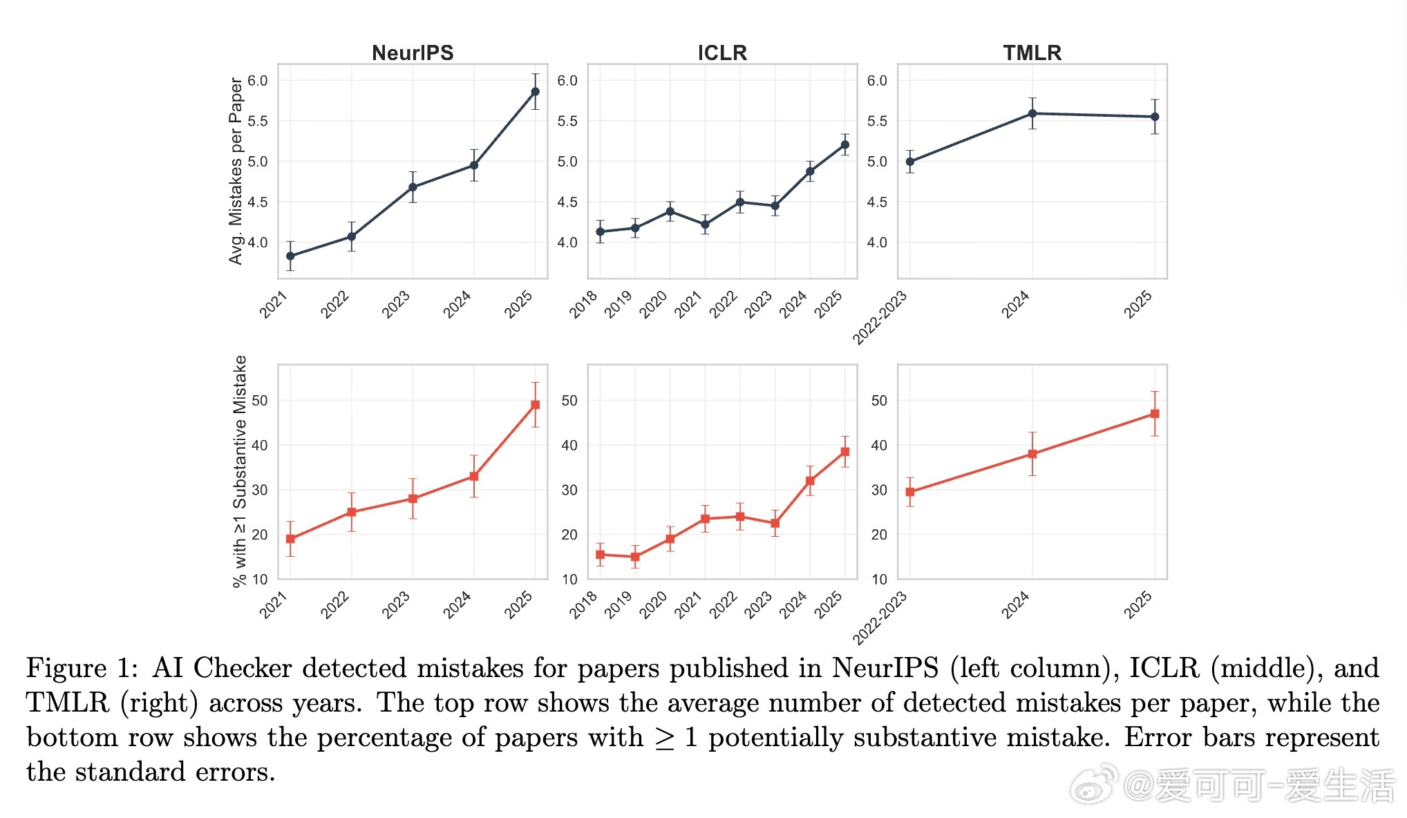 [AI]《To Err Is Human: Systematic Quantification of Errors in Published AI Papers via LLM Analysis》F Bianchi, Y Kwon, Z Izzo, L Zhang... [Together AI & NEC Labs America] (2025) 在AI研究高速发展的今天,顶级会议和期刊发表的论文中客观错误的数量令人担忧。本文利用基于GPT-5的“AI Correctness Checker”系统,首次大规模量化了NeurIPS、ICLR和TMLR等权威AI论文中的客观错误——包括数学公式、推导、计算、图表等方面的错误。关键发现如下:1. 错误普遍且逐年攀升。平均每篇论文发现约4.7处错误,NeurIPS论文从2021年的3.8处增至2025年的5.9处,增长超过50%。ICLR和TMLR论文也呈现类似趋势。2. 超过三分之一的论文至少含有一处“实质性错误”,这些错误可能影响结果解释和后续研究,甚至误导读者和产业应用。3. 误差类别中,数学和公式错误占比最高(54%),其次是文本描述(31%)、图表错误(9%)和交叉引用错误(5%)。4. 人工复核显示AI Checker的误报率较低,精确率达83.2%,且能正确修复75.8%的检测错误。5. 典型错误示例涵盖数据集规模夸大、数学定理证明不严谨、错误的线性代数和概率论步骤、公式推导错误以及文本与表格信息不一致等。这项工作凸显了当前AI论文审稿面临的巨大压力和复杂性,传统同行评审难以完全覆盖所有细节错误。前沿大语言模型作为辅助工具,可有效捕捉客观错误,提升科研成果的严谨性和复现性。作者建议结合AI辅助与人工复核,打造“人机协同”审稿新范式,既减轻审稿负担,又保障科学知识积累的质量。值得注意的是,AI Checker的检测依赖于文本和公式的准确解析,仍存在OCR误差和非标准符号带来的误判,同时召回率有限,意味着实际错误可能更多。对“实质性错误”的判定具有一定主观性,但整体趋势清晰:AI研究成果尽管丰富,严谨性仍需加强。这不仅是对科研质量的警示,更是推动审稿机制创新和科研工具升级的契机。用AI帮AI,守护科研诚信,让知识基石更牢固。详情请见论文原文:arxiv.org/abs/2512.05925