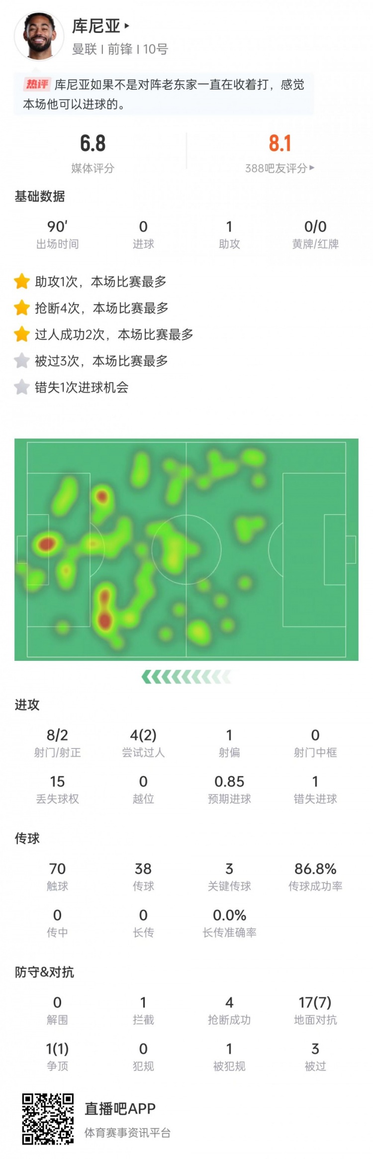 库尼亚数据:8次射门2次射正,3次关键传球+1次助攻,评分6.8
