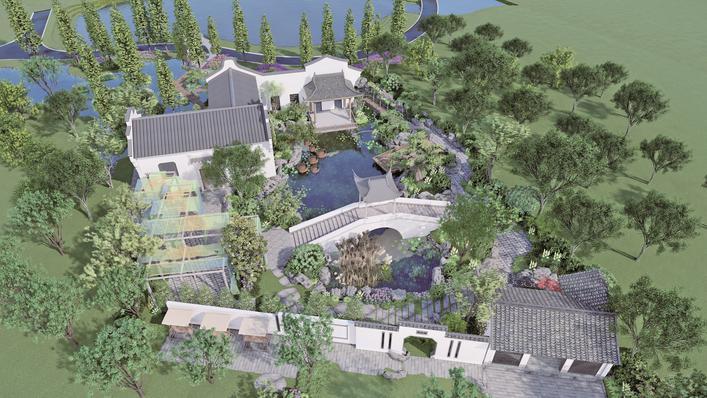 生态设计尤为突出。团队注重与自然环境的和谐共生,选用木材等绿色可再生材料,打造低碳可持续的景观园林。即便条件有限,仍通过布局巧妙保留525.6平方米的水域。水池以圆拱桥亭为界,分隔芦苇滩与主水面,搭配垂柳、荷花,再现水墨画境的虚实相生。