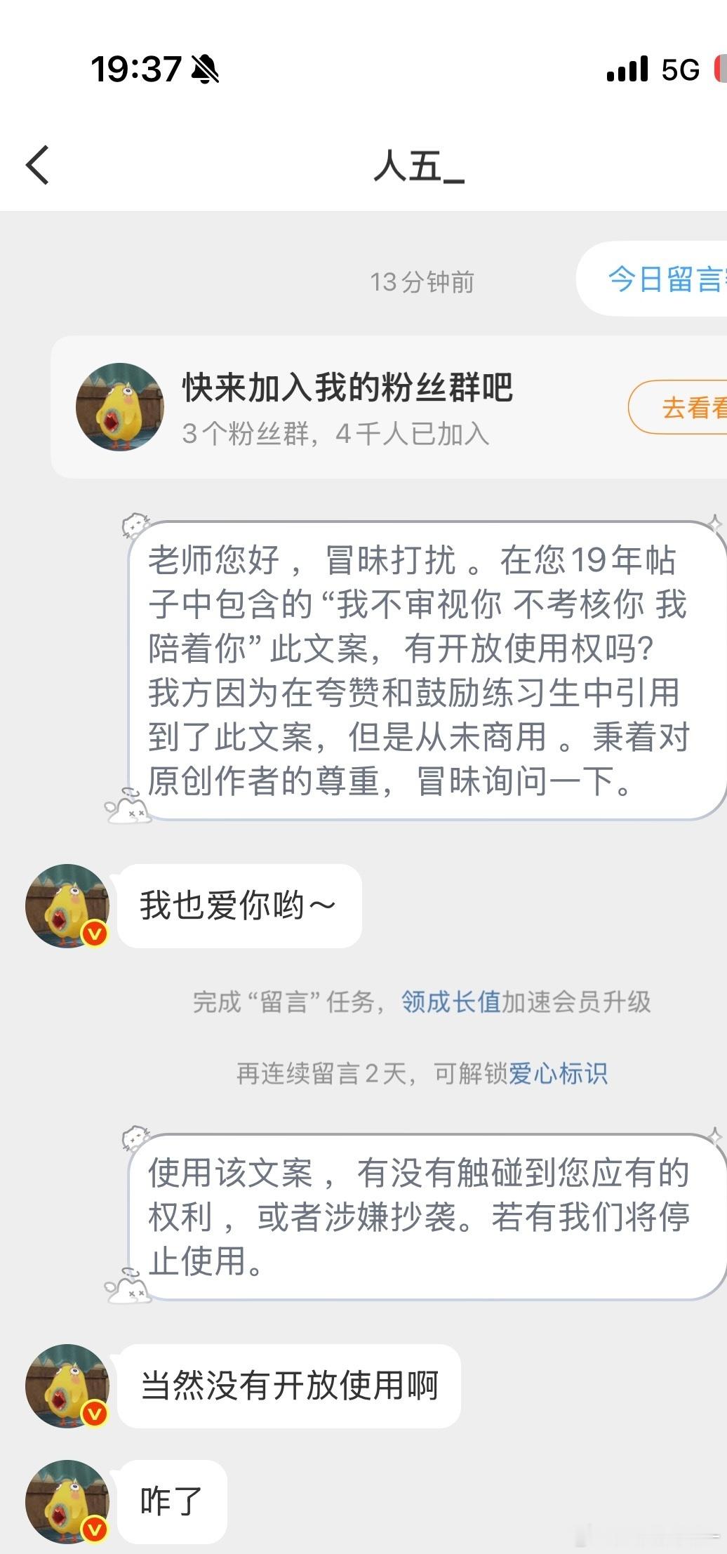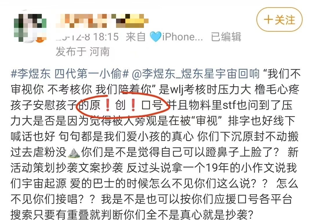 李煜东 橹粉认为争议的应援文案,并非原创,作为早已在网络上流传已久的文案,原作者同意使用作为应援鼓励使用,请问橹粉有什么意见比原作者还大呢?是买断了这句话吗?合唱和接唱应援活动在娱乐圈随处可见,几乎每家都举行过此类活动,李煜东数据组文案使用的是正常策划文案,重合部分为饭圈正常用语,如有意见,请问你方文案完全原创,没有和其他家有任何重合部分吗?麻烦不要借此事对李煜东和其粉丝发泄自己的情绪。