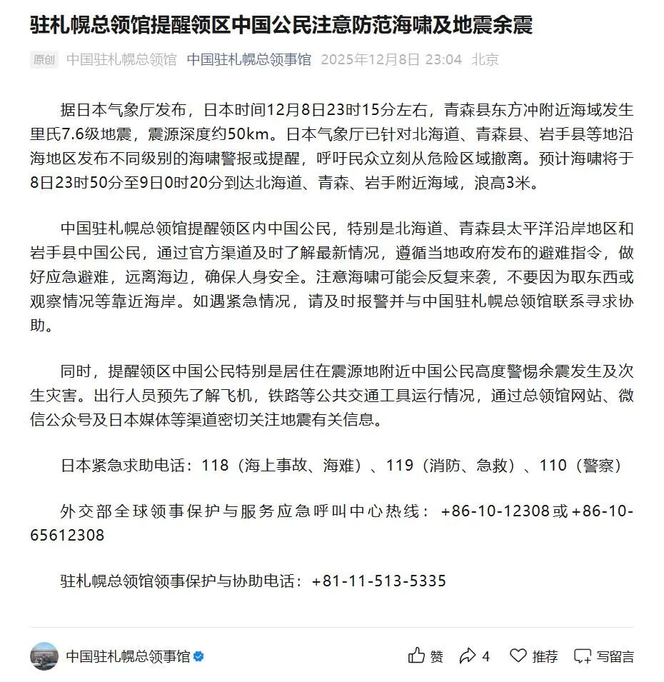 中国驻札幌总领馆提醒领区内中国公民,特别是北海道、青森县太平洋沿岸地区和岩手县中国公民,通过官方渠道及时了解最新情况,遵循当地政府发布的避难指令,做好应急避难,远离海边,确保人身安全。注意海啸可能会反复来袭,不要因为取东西或观察情况等靠近海岸。如遇紧急情况,请及时报警并与中国驻札幌总领馆联系寻求协助。