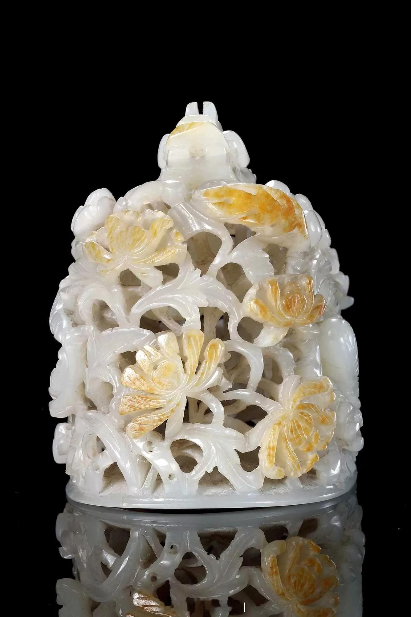 琳琅集 | 元 白玉俏色透雕龙穿花大炉顶明人高濂著《遵生八笺》,在论古玉时已提到自唐宋以来所制玉器中就有「炉顶」。此炉顶白玉质,晶莹温润,洁白无瑕,立体多层次镂雕,一龙从牡丹花丛中窜出头来,逗趣生动。龙头尖长,丹凤眼,浓眉粗长,长唇翘鼻,张口吐舌露牙,鹿形角,龙发后飘分成数绺。环节颈,龙身藏于花丛中,枝叶交缠,隐约可见,四足腿部均有鱼鳞纹,肘处有短阴线的护腕纹,昔称「筋骨毕露」,前足握有似孔雀尾形的火焰珠,四爪前勾。从纹饰上看,牡丹花瓣内凹为元代特征之一,此种尺寸及玉质的炉顶甚为少见。此件炉顶材美工精,构图舒朗圆浑,线条生动流畅,花与龙相互交映,既有祥瑞之意,又寓繁荣昌盛之愿。本品选材精良,雕工精湛,集瑞兽之威与花卉之美于一体,兼具观赏性与文化内涵,且体量颇大,尤宜陈设收藏,堪称炉顶之王,为玉雕艺术中的难得佳作。尺寸:直径22cm;高14.6cm来源:保利2025秋拍《禹贡—纵横以和,天府永藏》