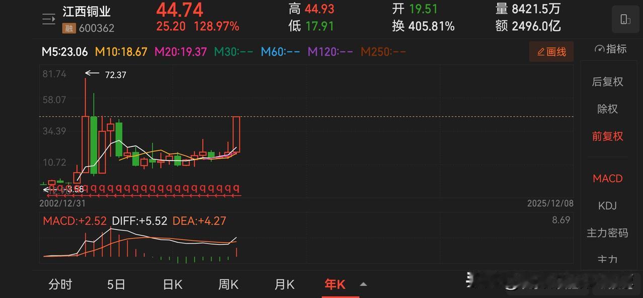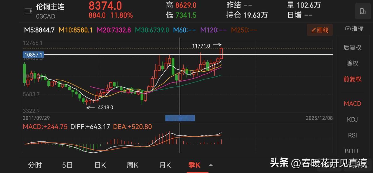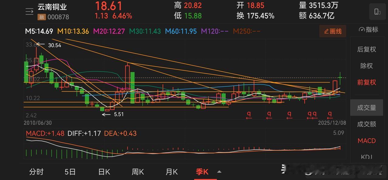 伦铜的这次突破是有效的,后续的大方向已经明确,就是向上。在这种情况下,叠加国内的产业政策调整因素,上市铜企业迎来一段好时光。 紫金矿业、洛阳钼业和江西铜业都完成了不错的涨幅,与之相比,云南铜业就是个渣渣,可以说严重辜负了我的期望,也正因如此,现在反而成了现在的希望所在。 生活中到处充满了悖论和辩证法。