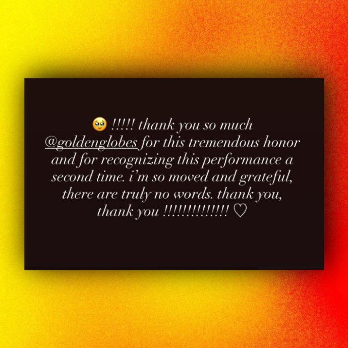 A妹回应二次提名金球奖 爱莉安娜·格兰德 Ariana Grande 回应第二次获得金球奖提名: "衷心感谢授予这份殊荣,并再度认可此次表演。我深受感动、无比感激,此刻无以言表。谢谢。"
