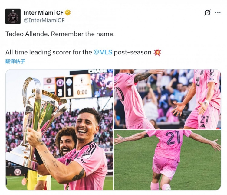 迈阿密国际社媒晒出阿连德捧杯的照片,配文:“阿连德——记住这个名字,美职联历史(单届)季后赛射手王。”