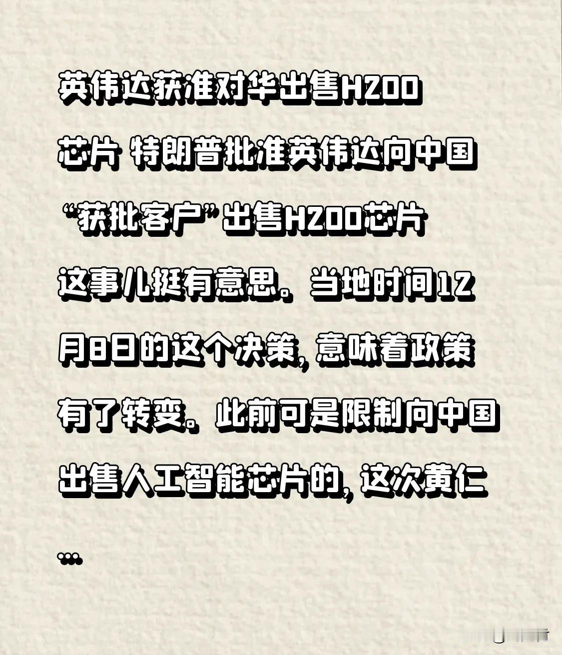 英伟达获准对华出售H200芯片 英伟达获准对华出售H200芯片,特朗普批准英伟达向中国“获批客户”出售H200芯片一事耐人寻味。当地时间12月8日作出的这一决策,标志着政策转变。此前美国一直限制向中国出售人工智能芯片,此次黄仁勋数月的游说取得“重大胜利”。 不过,获批的H200并非英伟达最先进产品,更领先的Blackwell和未推出的Rubin均不在出售范围内。并且,美国政府会从销售额中抽取25%分成。此外,相关规则同样适用于AMD、英特尔等公司。特朗普称此举是为支持美国就业、强化制造业,实则另有算计。 英伟达 英伟达公司 英伟达股价行情 英伟达市值回落 英伟达芯片出口