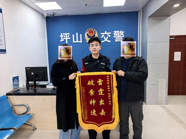事后,屈某对坪山大队高效办案表示高度赞赏与衷心感谢,专程到坪山大队将一面印有“雷霆出击,破案神速”字样的锦旗送至民警手中。