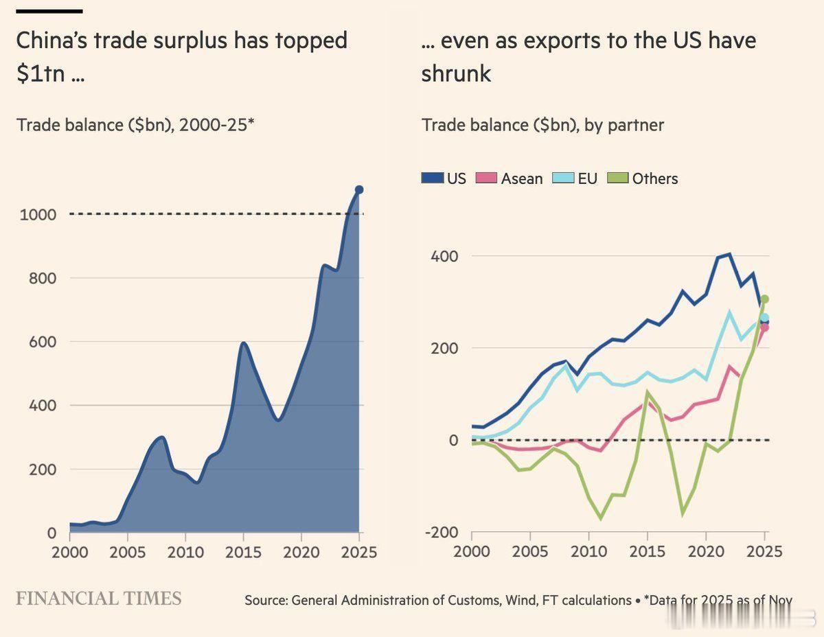 🚨🇨🇳🇺🇸中国重塑了全球贸易格局——而美国却被远远甩在了后面2025 年前 11 个月,中国的贸易顺差突破了 1 万亿美元——更令人惊讶的是:美国几乎没有参与其中。仅11月份就实现了1120亿美元的出口额,创下年中以来的最高月度纪录,扭转了10月份的下滑趋势。出口同比增长5.9%,打破了此前市场对出口疲软的预期。但美国呢?完全被排除在外。由于北京将货物转运至欧洲、东南亚、非洲和拉丁美洲,对美出口同比暴跌约29%。结果是:一个能够抵御美国关税的全球贸易网络,使中国的出口机器保持高速运转,而美国决策者却手忙脚乱。中国不只是在规避关税……它正在重塑全球采购格局。需求跟随供给而变化,而非相反。即使国内消费疲软,房地产市场低迷,半导体、船舶和汽车等关键行业仍呈现高于平均水平的增长。教训是:如今推动中国贸易主导地位的是全球市场,而不仅仅是美国。预计布鲁塞尔及其他地区将出现日益加剧的摩擦。像马克龙那样的关税威胁可能会接踵而至,但重新规划的运输路线使得单一区域的保护主义在很大程度上无效。供应链将重新调整:制造中心可能会迁移,贸易走廊可能会转移,“中国冲击2.0”将在各行各业产生影响。简而言之:中国将美国关税武器化,将其转化为全球销售闪电战,不费一枪一弹就重塑了世界贸易格局。美国被彻底冷落了——而世界其他国家只是匆匆收到了通知。