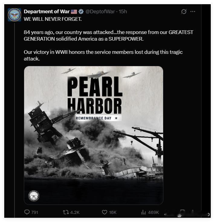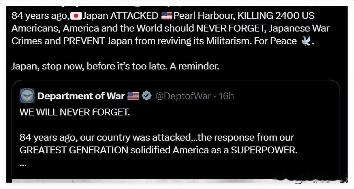珍珠港纪念海报忘了日本?美国这波操作引热议 各位老铁,今儿个咱聊聊美国国防部的翻车操作。12月7号晚上10点,美国国防部在社交账号发了个纪念珍珠港遇袭84周年的海报,配文我们永远不会忘记。这本该是个很严肃的纪念活动,结果美国这波操作,让不少网友直呼太离谱! 为啥说离谱呢?因为海报里没提当年袭击珍珠港的始作俑者是谁,整整84年了,居然忘记了日本这个罪魁祸首。这不就跟你说我们永远记得那天被偷了钱包,但就是不提小偷是谁一样吗?评论区直接炸锅了,一位爱尔兰网友说得好,二战期间日本杀害的人数远超其他国家,却在一定程度上逃脱了应有的惩罚。 更绝的是,美国国防部这海报里还出现了个大乌龙。三架正在袭击珍珠港的敌机中,居然有一架是美国自己的TBF轰炸机。这就好比你拍个我们永远记得被抢劫的照片,结果照片里混进了一张自己抢劫别人的照片,这不是自己打自己脸嘛。 我查了查资料,今年美军纪念活动确实有点不一样。去年美军司令还大谈美日友谊是珍珠港事件的伟大遗产,今年却连美日友谊都不提了,只说美国永远不会忘记战争历史。这变化,跟日本首相高市早苗最近的言论有关系吗?高市早苗在台湾问题上的表态,让中方很不满,美国也感受到了压力。 说真的,美国国防部这波操作,有点像在历史修正主义和现实政治之间摇摆。一边要纪念历史,一边又要和日本保持战略关系,结果把历史给忘了。 最让我动容的是那些珍珠港幸存老兵的故事。今年纪念仪式上,首次没有幸存者出席,因为当年的12名老兵都已年过百岁。101岁的罗素在视频中说,429名兄弟就这样没了,他们的尖叫声至今回荡在我耳边。这些老兵,才是真正记住历史的人。 美国国防部这波操作,让我想起那句老话,忘记历史就意味着背叛。历史不能被抹去,更不能被忘记。日本军国主义的阴魂不散,我们不能掉以轻心。 大叔想问问大家,你觉得美国国防部这次忘记日本,是疏忽还是有意为之?欢迎在评论区留言讨论,点赞关注不迷路,咱们下期再见!