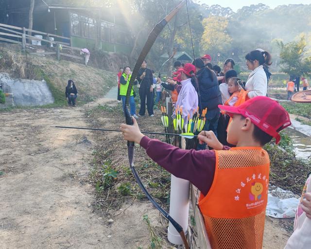 带着期待的心情,队伍来到“勇气挑战园”。在这里,孩子们依次体验射箭与攀岩项目。拉弓、瞄准、放箭,孩子们神情专注,箭矢破风而出;双手握绳、手脚协调、向上攀登,小小的身影在山坡上稳步向上。每一个孩子都勇敢尝试、突破自我,展现出令人欣喜的协调性与勇气。