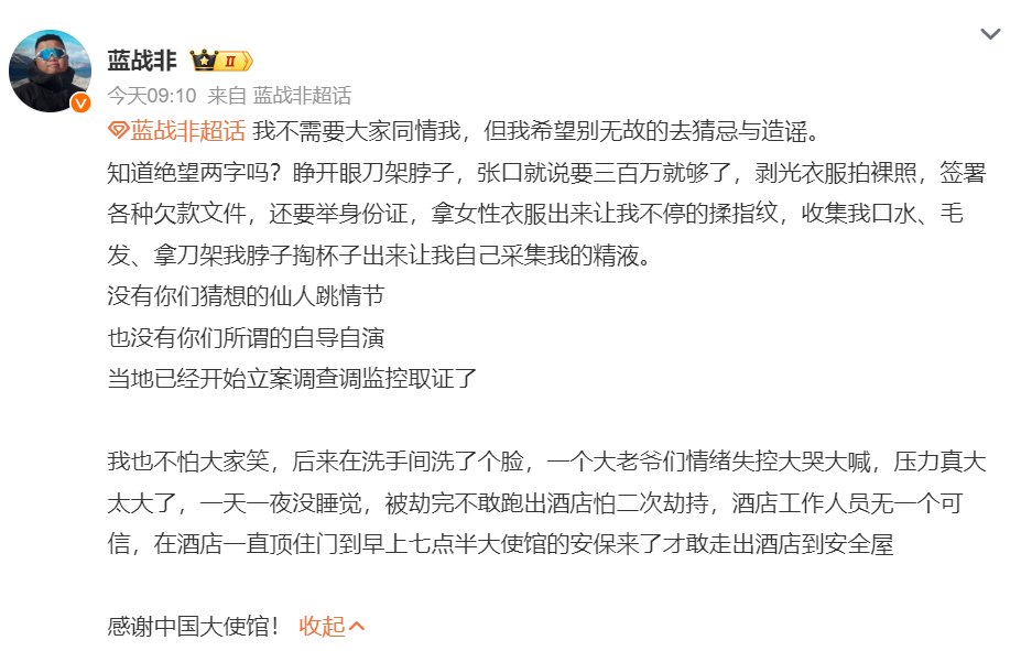 蓝战非称被绑架 看网红蓝战非的描述跟恐怖片似的,忒吓人了!提前半年蹲守南非机场,买通五星级酒店员工,直接开门抢劫......好在人没事,只能说国外没有想的那么安全,异国他乡小心为上!