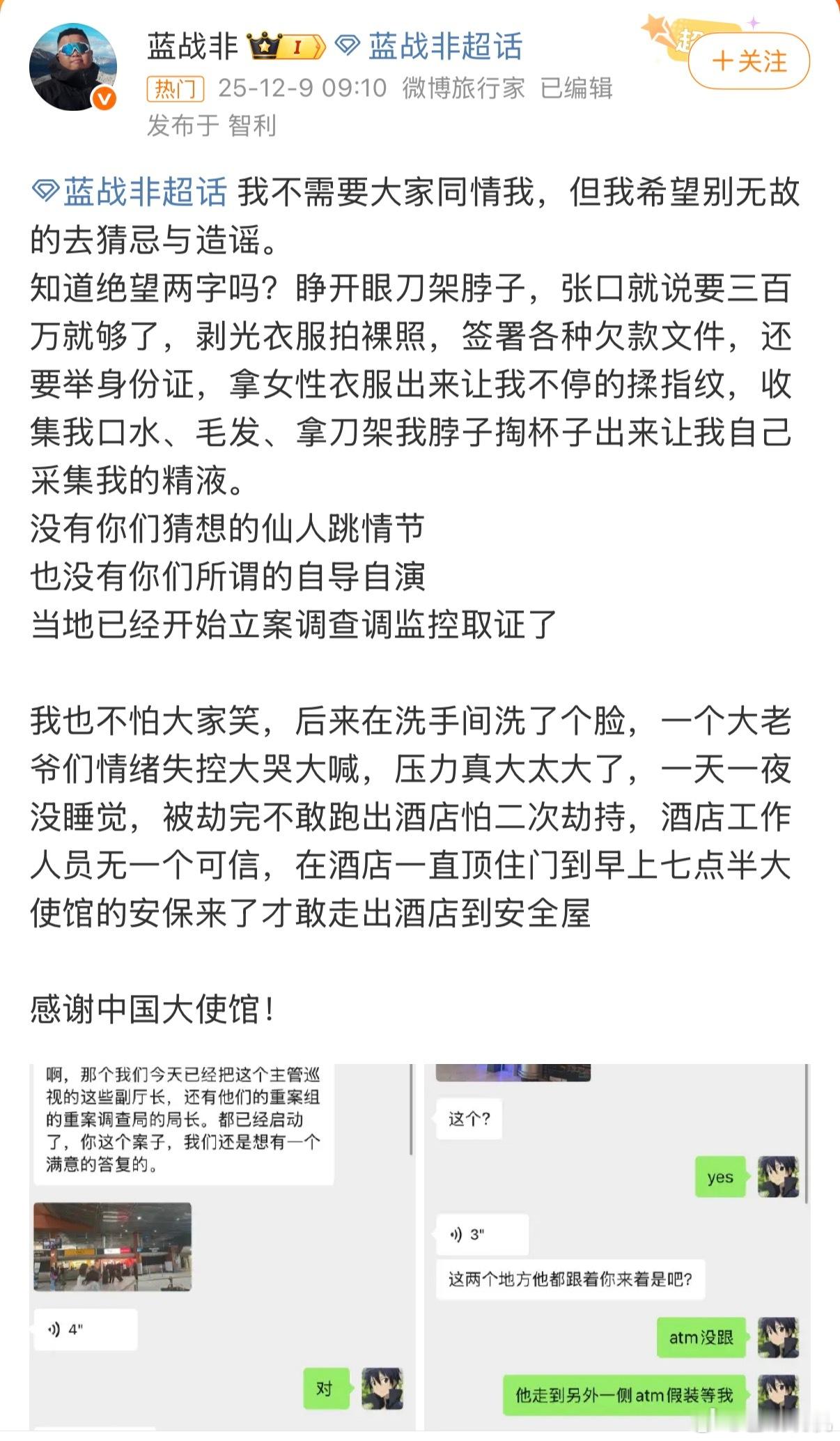 蓝战非称被强迫拍裸照蓝战非在南非被绑架,绑匪提前半年布局,买通航空公司和酒店人员,直接刷房卡进去给绑了,被人盯上了再怎么小心也没辙啊…
