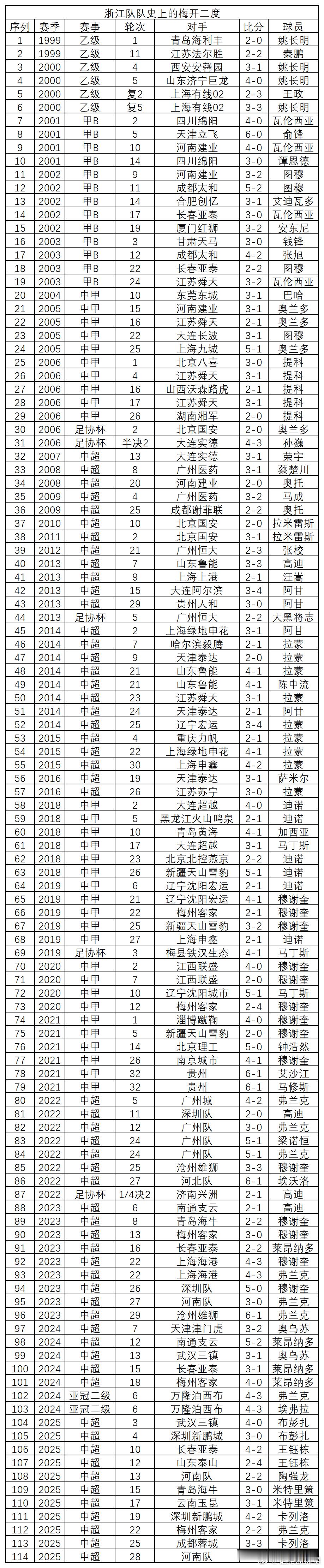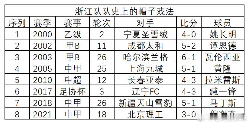 浙江队队史单场比赛梅开二度、帽子戏法球员及比赛分布数据首发如下,请各位查阅,如有
