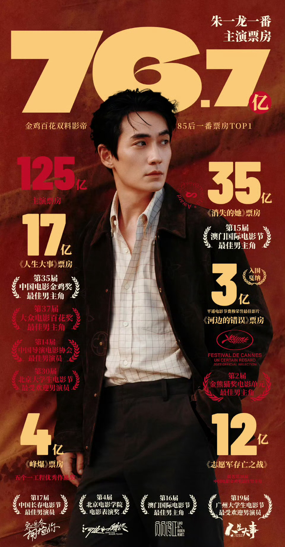 2025最具票房号召力男演员80后唯一金鸡百花影帝,9座影帝奖杯熠熠生辉!四年7部一番狂揽76亿,主演票房破125亿!从莫三妹到李想,角色无缝切换,票房口碑双爆,国民影帝朱一龙,实力与号召力双巅峰朱一龙