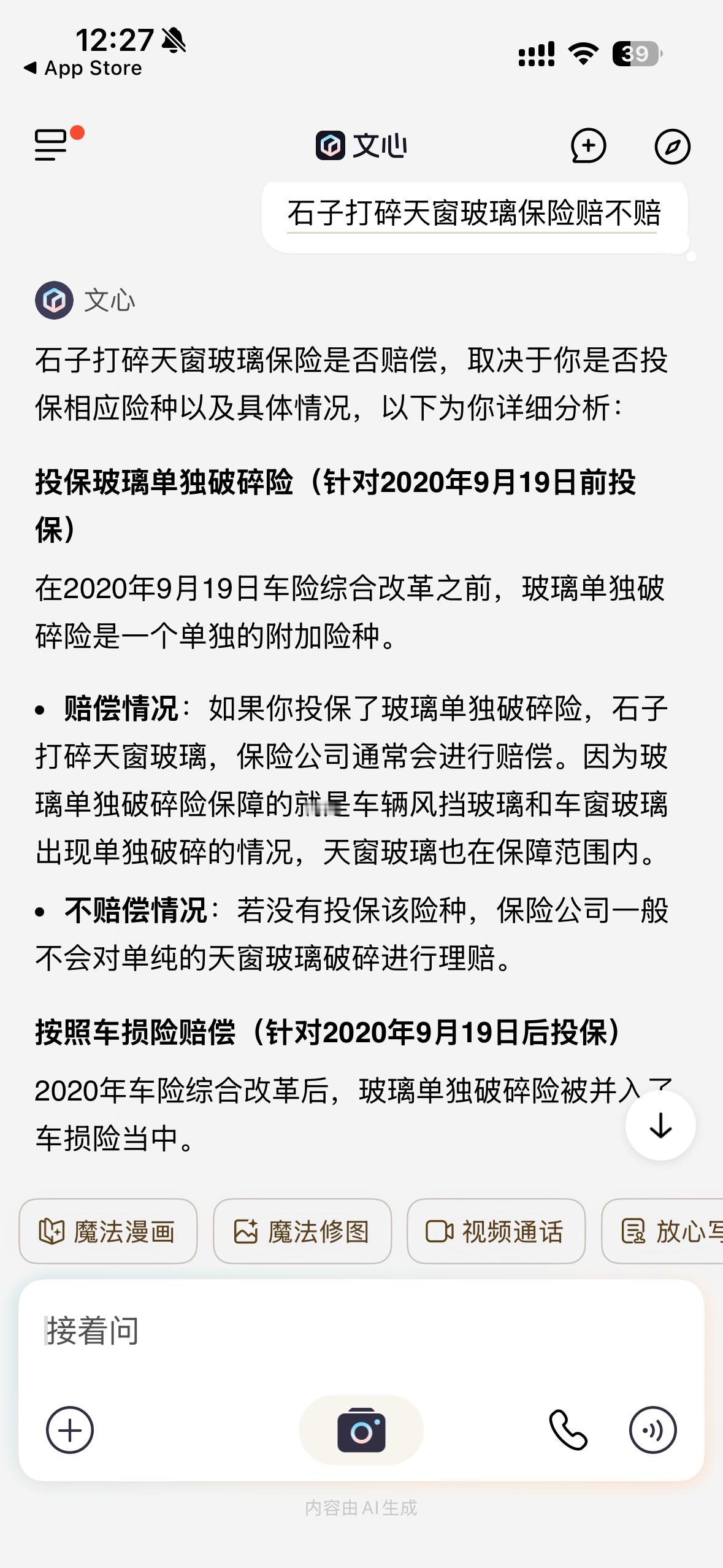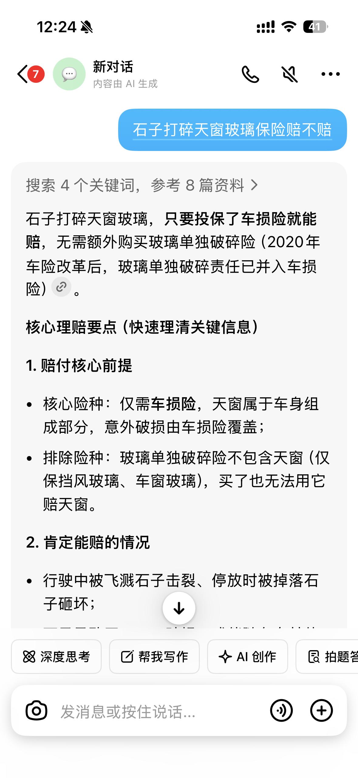 一个石子儿真的能砸裂车顶天窗玻璃么?求科普!小编中午下班的时候,本来要美汁汁儿的回家吃午饭,顺便给老板的小鹏M03送去洗车,车开到半路上,路上飞溅的小石子不知道怎么的蹿到了天窗上,听着一声清脆的“咔嚓”就感觉不妙,停下车抬头一看车顶天窗上裂出来了一个口子…本来以为离谱到家了,结果网上一搜发现好多车友都遇到过,真是涨知识了!现在整个人在风中凌乱…这玩意坏了该怎么处理才好?怎么能确保换到的新玻璃是原厂的玻璃?包含全车玻璃(包括天窗)的损险该怎么定险维修?别的不说,主要是这车是老板的车…AI已经翻遍了…要是再找不到合适的途径和方法,怕是这个月要赔钱上班了…(顺便求求小鹏官方,看看孩子吧…)
