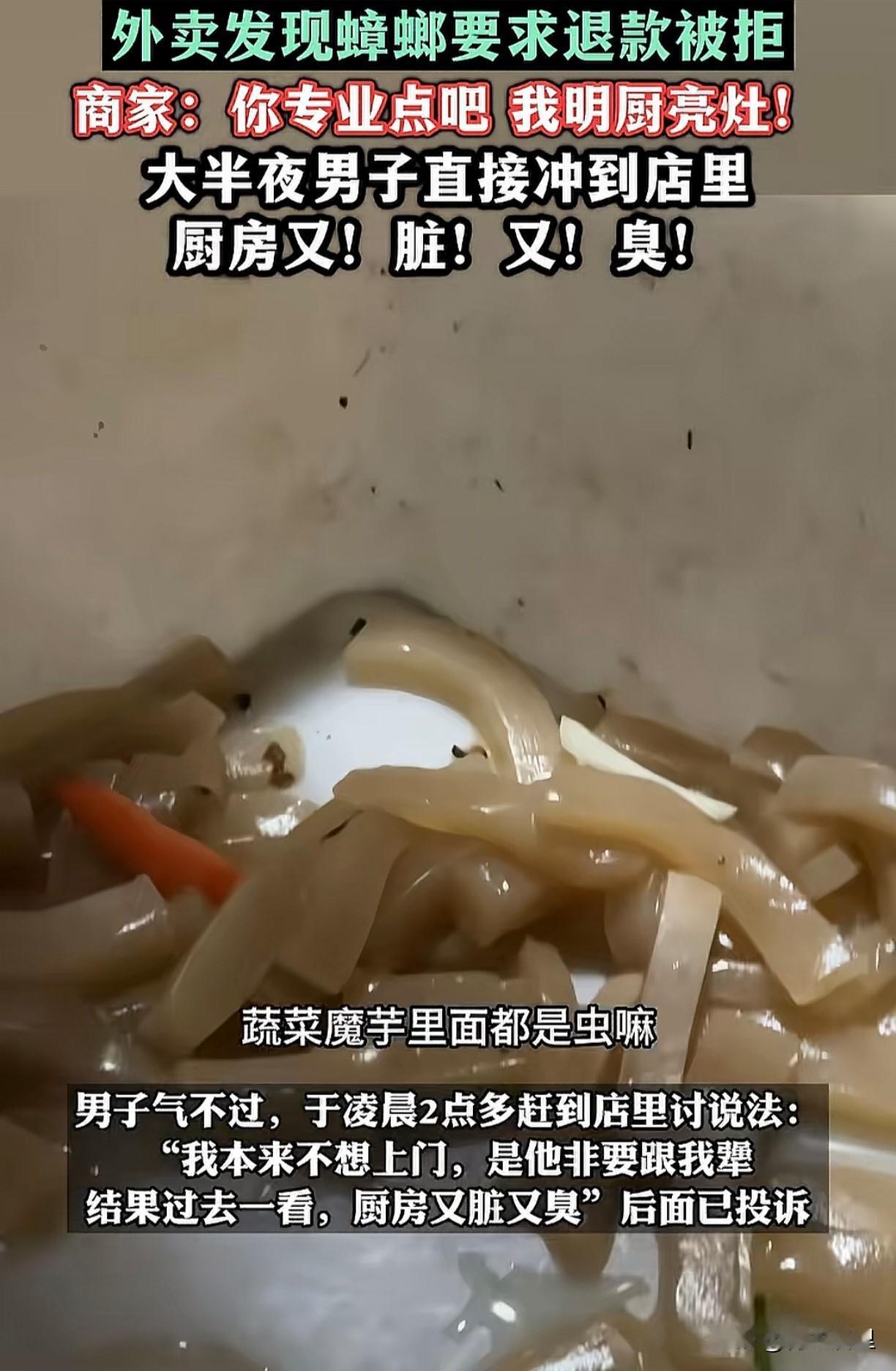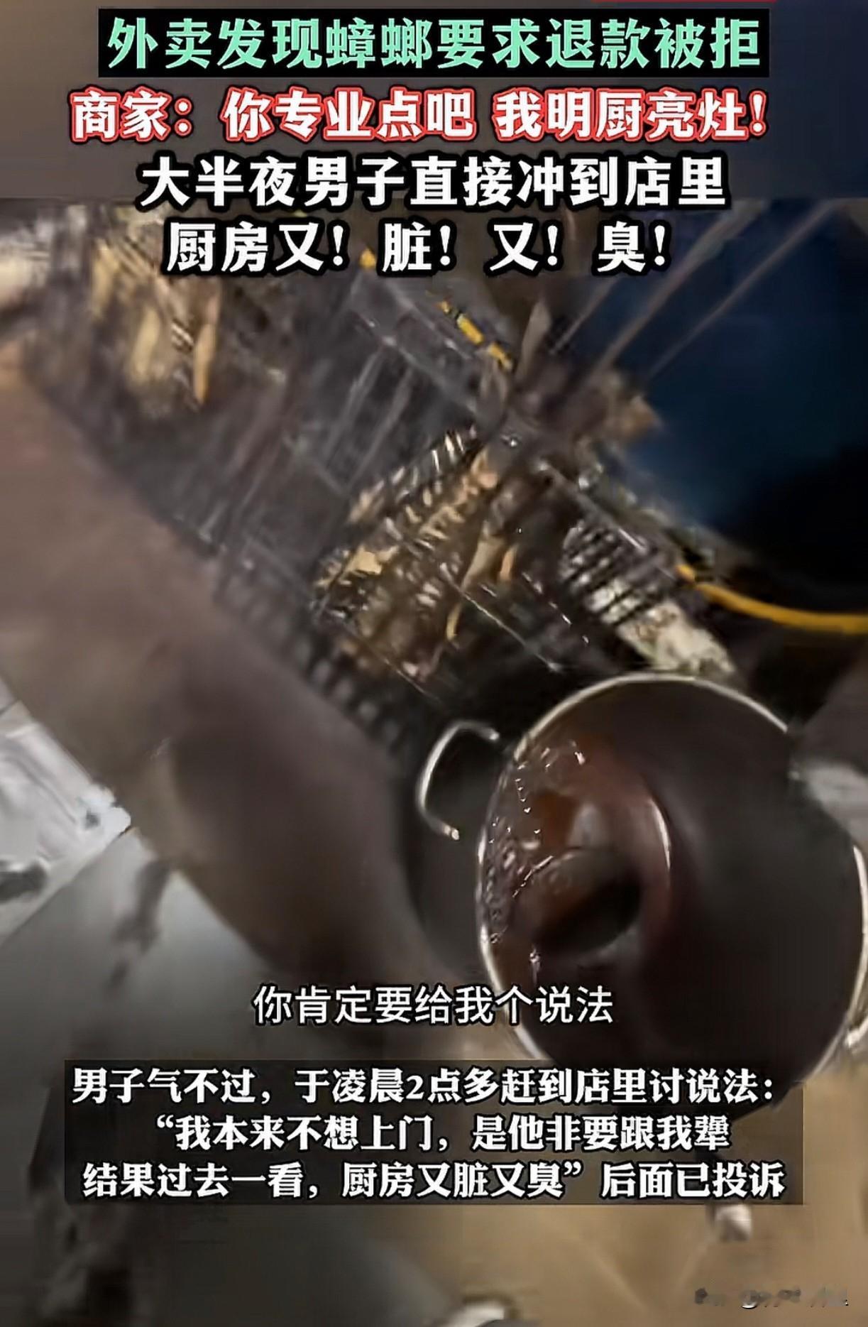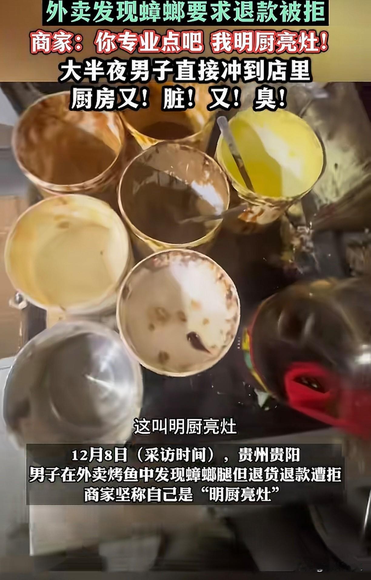 12月8日,贵州一小伙点了一份外卖烤鱼,拿到手之后,刚准备开动,结果发现意外之喜。烤鱼中有额外的蛋白来源,一根蟑螂腿。看到这一幕,虽然饥肠辘辘,但小伙始终没有下嘴。随即找到商家要求退货退款,但遭到商家拒绝,表示:“自己是明厨房亮灶,餐品里不可能存在其他东西,大哥专业点,可以不”。 自己饿了这么久不说,点的外卖里有蟑螂腿还不能退款。小伙越想越气,于是凌晨两点驱车登门讨说法。刚进后厨,映入眼前的是一片脏乱的景象,调味品发黑,菜篮子里都是灰,蔬菜魔芋里都是虫子。小伙录下证据之后,直接就投诉了。 点外卖确实方便,不用自己费心,花力气去做,吃完了也不用洗碗。唯一一点就是迈不过食品安全这个坎,不如自己做的干净卫生。下次点外卖,还是得多看看评价,多留个心眼。别到最后为图省事,把身体吃坏了,就得不偿失了。