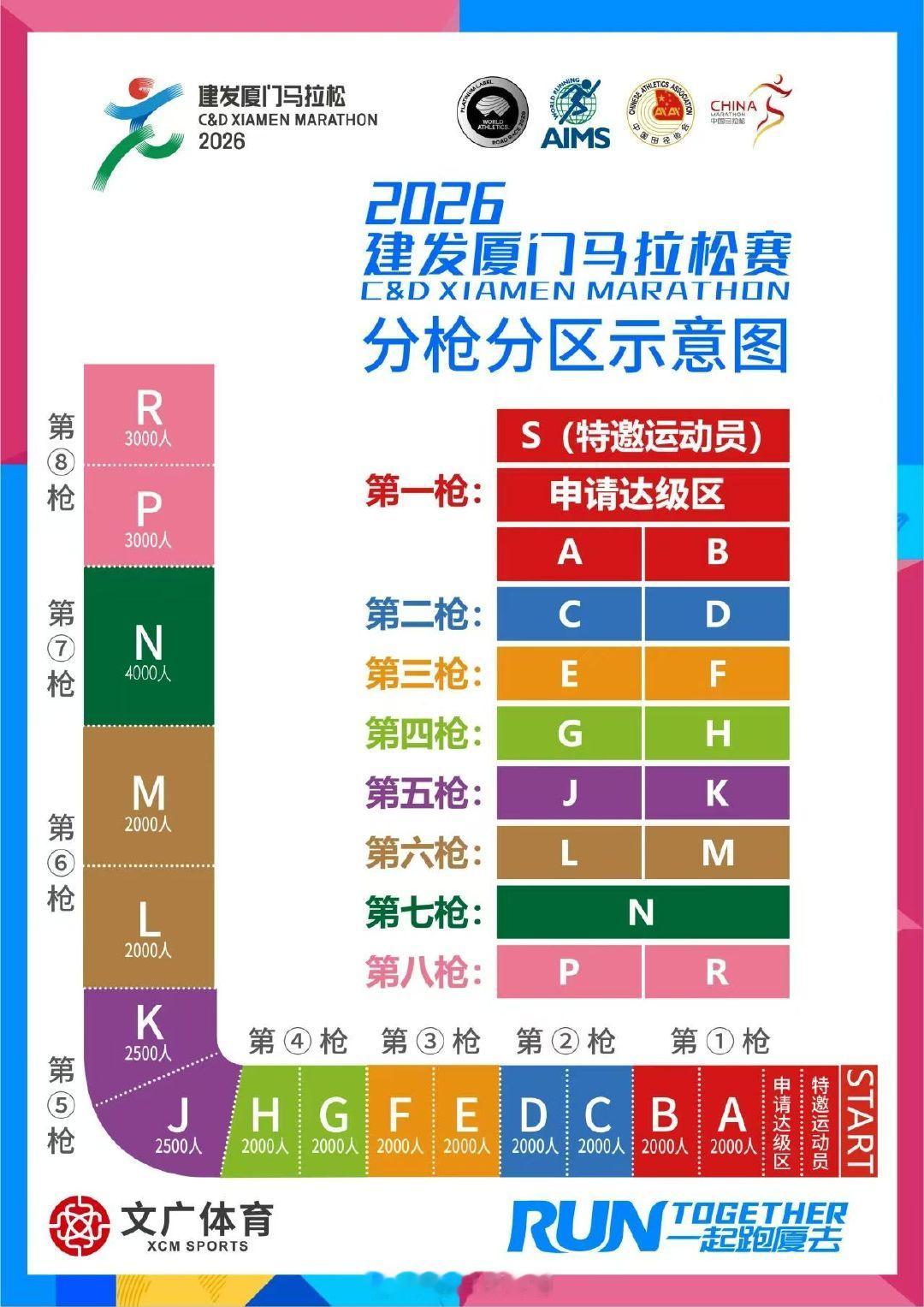 2026厦门马拉松分枪分区成绩范围及人数确认。第一枪卡到3:01:28,大差不差明年厦马能有四千左右破三的吧。第二枪卡到3:19:46,其实并不太苛刻。第八枪就是PR区。厦门马拉松 赛事组织 2026厦门马拉松