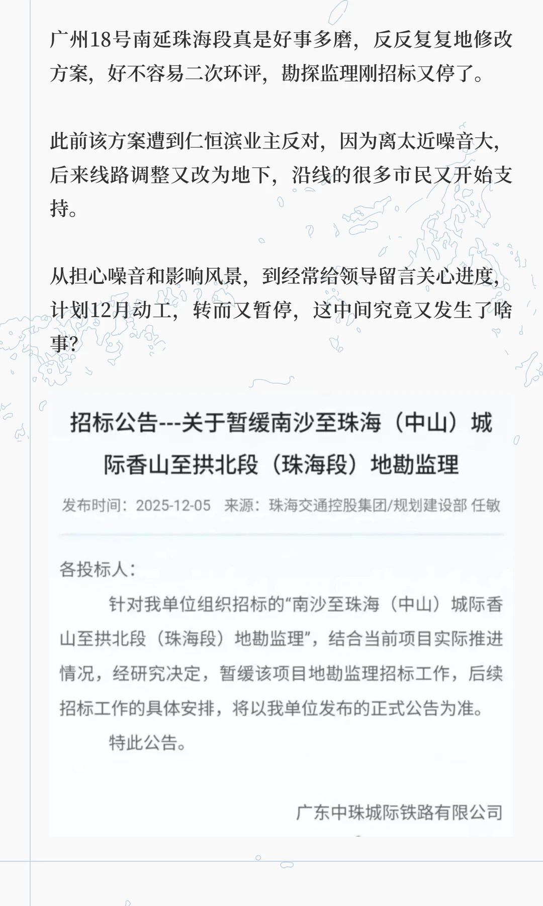 广州18号南延又出状况,珠海段暂停勘探招标