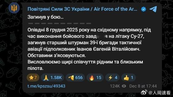 乌克兰一架苏27坠毁一架隶属于乌克兰第39战术航空旅的苏-27战斗机在哈尔科夫地区上空执行作战任务时被俄罗斯防空系统击落。该飞机的飞行员伊万诺夫·叶夫根·维塔利耶维奇中校未能成功弹射逃生,不幸遇难。军事