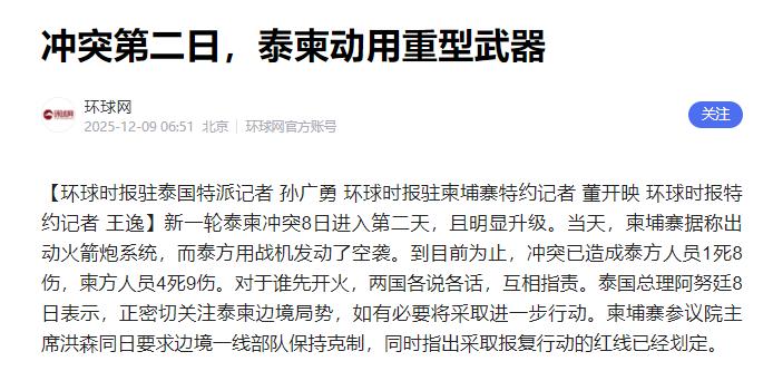 新一轮泰柬冲突刚进入第二日,就已演变成重型武器对决!柬埔寨火箭炮齐射,泰国战机直接升空空袭,战火瞬间升级。目前泰方1死8伤、柬方4死9伤,双方却各执一词,都咬定是对方先开的火。泰国总理放话将择机进一步行动,柬埔寨洪森则划下报复红线,局势一触即发。 冲突才两天就亮火箭炮、战斗机这些大杀器,绝对不是小摩擦,风险大得很。别觉得边境吵吵架正常,一动重型武器就说明两边都没打算轻易收手,搞不好会全面开打,最后最倒霉的还是老百姓。 这些重武器有多吓人?泰国战机一升空,军营、周边村子学校都可能被炸平。 柬埔寨火箭炮火力猛,一炸就是一片,之前还炸过加油站伤了平民。才打两天就动这些家伙,可见两边矛盾多深,下手多狠。 这不是一时冲动,是老矛盾闹的。泰柬边界800多公里一直没划明白,最争得厉害的是柏威夏寺周边的地。这寺庙是世界遗产,两边都当宝贝,国际法院早判归柬埔寨,泰国就是不认。 2011年就因为这打过,当时也用了重武器,伤了不少人,老百姓都被迫搬家。现在再来,一上来就动重器,就是想在争议地上占上风。 现在已经死了5人、伤17人,再用重武器,伤亡只会更多。今年7月两边打仗,没几天就死了三十多人,一半多是平民,上万老百姓流离失所,学校停课、口岸关门,边境全乱了。 泰国那边损失超22亿人民币,酒店、生意全停,老百姓日子过不下去。现在才第二天就动重器,不刹车,7月的惨状就会重演。 更让人担心的是,两边都说是对方的错,把自己当受害者,很容易让局势失控。其实背后都是国内压力大,想靠边境冲突转移老百姓注意力,这太不负责任了。 现在两边领导人还在说硬话,这不是护主权,是火上浇油,一旦越了红线,后果不堪设想。 而且这冲突不只是两国的事,还会影响东南亚稳定。7月就有炮弹落到老挝,让周边国家心慌。现在东盟虽在劝和,但两边动了重器,信任没了,再想坐下来谈就难了。 说到底,泰柬都是发展中国家,老百姓就想过安稳日子,边境人生意、旅游都靠跨境,一打仗全完了。 解决争议靠的不是炮大、战机先进,而是坐下来谈。现在国际社会、东盟都在劝和,这是降温的好机会,再打下去只会两败俱伤,没赢家。 希望两边能听老百姓的话,赶紧停火谈判,和平才是对边境人最大的负责。