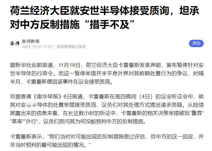 荷兰内部开始批斗经济大臣,质问他抢夺中资安世公司时,考没考虑后果?他辩解说,当时深思熟虑,认为中国不会限制芯片出口,现场哄堂大笑。 被抢的安世半导体,可不是路边随便捡的小公司,最早是荷兰飞利浦手里的核心业务,后来划给了恩智浦。 2019年中国闻泰科技花340亿真金白银把它买下来的时候,荷兰政府可是白纸黑字签了字的。 可他们没料到,中国企业接手后短短几年,变成了黑马,宝马、大众、特斯拉这些巨头的生产线,离了它的芯片根本转不动,本来是中荷两边都挣钱的美事,荷兰突然翻脸了。 今年9月底,美国搞了个"50%股权穿透规则",把闻泰科技列上了黑名单。荷兰第二天就跟上了,居然搬出1952年冷战时期的《物资供应法》一部七十多年没怎么用过的老法案。 他们张口就说安世"威胁国家安全",宣布冻结全球资产,手段霸道得没边,转脸把中方CEO张学政撤职,把闻泰99%的股份交给第三方托管,只留1股装样子。 闻泰说这是"有预谋的抢劫",一点都不夸张。更有意思的是,后来安世中国披露,荷兰公司还拖欠着东莞工厂高达10亿元的货款,这哪儿是监管,分明是又抢又赖。 现在的中国早不是百年前任人拿捏的样子。10月4日,中方直接宣布对安世东莞工厂的芯片实施出口管制。 安世在欧洲是有晶圆厂,能产芯片毛坯,但全球八成的封装测试都在东莞,欧洲车企要的成品芯片,全得从中国运过去。这道禁令一落地,全球汽车供应链立马炸了锅。 别小看这些小芯片,汽车的电子控制、安全系统全靠它撑着,缺一颗就能让几十亿的生产线停摆。 欧洲汽车制造商协会急得跳脚,预警说再这么闹下去,全行业要亏200亿欧元,10万个工作岗位都保不住。 荷兰自己更是搬起石头砸自己的脚。本土的晶圆厂只产毛坯,运到东莞加工好的成品回不去,10月份就堆了3亿欧元的库存,几家工厂只能缩减产能开始裁员。 更讽刺的是,荷兰半导体巨头ASML也跟着遭殃,中国市场占了它近三成的营收,禁令一出股价单日就暴跌8.2%,市值蒸发超百亿欧元。 要知道ASML单台光刻机就得用10公斤以上中国稀土磁体,镜头抛光还依赖中国材料,现在库存只够撑8周,部分设备交付都开始延迟了。 到了11月,荷兰是真顶不住了。19号宣布暂停针对安世的行政令,中方也立马取消出口限制,算是给了他们个台阶。 但这事儿没完,商务部说得明白,暂停不等于结束,张学政的职位得恢复,托管的股权得还回来,这才是解决问题的根本。 更打脸的是,卡雷曼斯本来定好12月9号访华,结果中方根本不待见他,他只能找"日程冲突"的借口取消行程,荷兰议员都直言不讳:他就是被中方拒绝了。 在最近的议会听证会上,卡雷曼斯一边承认自己被中方反制打了个措手不及,一边还想甩锅,说这个决定是首相、副首相等多位要人共同定的,试图拉人一起分担火力。 这场闹剧还意外推动了人民币国际化。安世中国恢复供货后,所有订单都用人民币结算,10月欧元区对华芯片采购的人民币结算占比,从12%一下飙到35%。 卡雷曼斯的"没想到",本质上是对中国实力和决心的双重误判。说到底,商业就是商业,别总搞政治操弄。想靠耍横抢东西发财,最后只会砸了自己的饭碗。