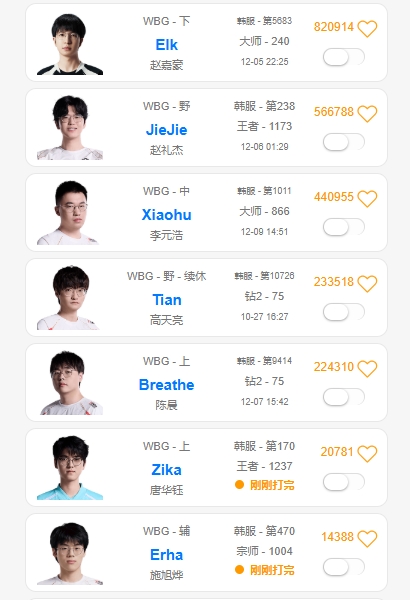 截止目前,仅有几支队伍阵容大致确定,其中WBG阵容为上单Zika、打野Jiejie、中单Xiaohu、下路Elk、辅助Erha。从选手的排位数据来看,Zika、Jiejie以及Erha在11月份仍然保持Rank的习惯,但Zika12月2日之后中断至今天再次恢复Rank;Jiejie12月6日之后中断至现在;而Erhh则一直保持高强度,哪怕全明星期间也还在RANK;Xiaohu12月3日到4日开始恢复高强度训练,5日-7日全明星中断,8号至今又恢复高强度;Elk从12月3日-12月5日恢复高训度训练,12月5日之后中断至现在。