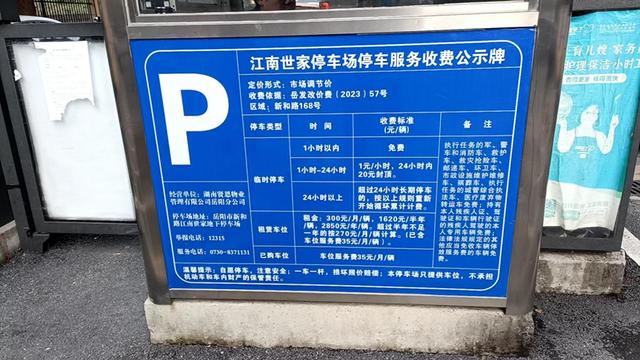 记者在江南世家地下停车场入口处看到停车服务收费公示牌。公示牌标示该停车场收费形式为市场调节价,收费依据岳发改价费(2023)57号,车位租金300元/月,2850元/年。