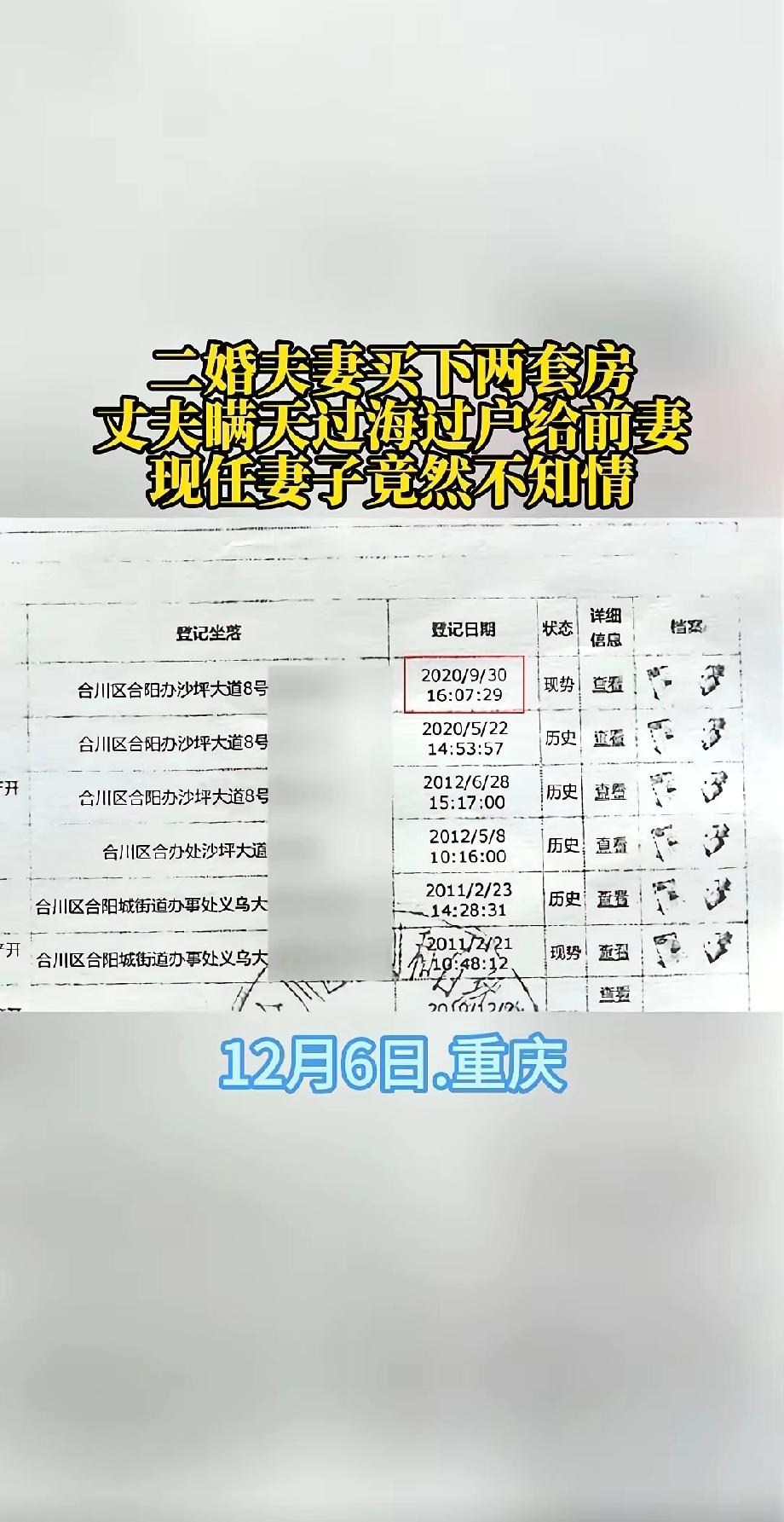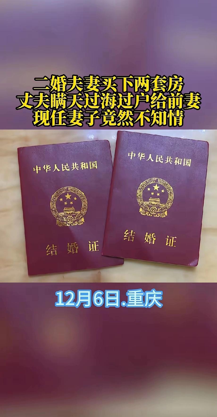 二婚中最会算计的男人出现了,不仅重庆人民知道了,这下全国人民可能都知道了! 12月6日重庆曝出的这起事件,比之前的案例更让人心寒。一对二婚夫妻婚后共同攒钱买下两套房,现任妻子一直以为这是两人后半辈子的依靠,直到办房产手续时才发现,房子早被丈夫偷偷过户给前妻,自己手里连半张有效产权证明都没有。 婚后现任妻子省吃俭用,每天早起做早餐,下班包揽所有家务,连丈夫的旧衣服都缝补着穿,就为多攒钱买房。丈夫嘴上说“以后咱们守着这两套房养老”,转头就骗现任签了一堆“无关紧要”的文件,悄悄把房子过给前妻,还转走了大半存款。 现任妻子质问时,丈夫只说“那是我跟前妻的共同财产,该还给她”,完全不提这两套房里有一半是现任的血汗钱。丈夫的前妻还找上门,拿着房产证炫耀“他心里从来没放下我,你就是个免费保姆”。 二婚是经历感情挫折后,重新找踏实日子的选择。有人却把这当算计的幌子,一边享受现任的付出,一边拿对方的血汗钱续旧情,把婚姻里的信任踩得稀碎。 这种算计不是简单的财产纠纷,是把别人的真心当成可以拿捏的软柿子。婚姻里的真诚不分头婚二婚,没有信任的婚姻,连纸糊的房子都算不上。 各位读者你们怎么看?欢迎在评论区讨论。