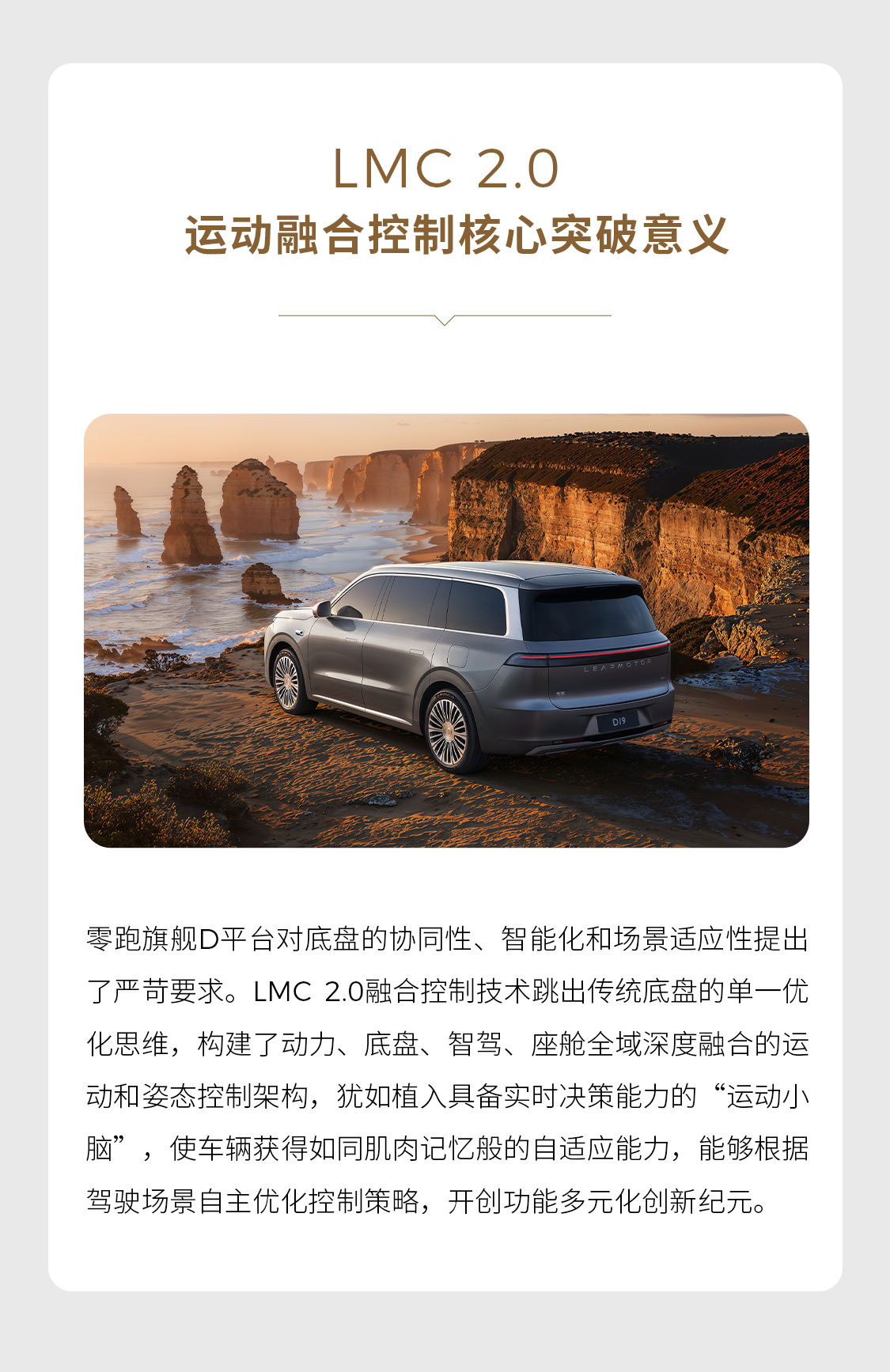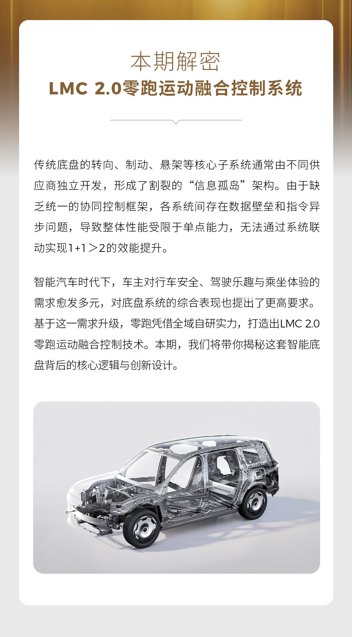传统底盘各系统“各干各的”形成“信息孤岛”该如何通过系统联动实现1+1>2的能效提升?零跑旗舰D平台 LMC 2.0 零跑运动融合控制技术藏大招!《D100 个秘密》专栏第五期:结合十大智能场景,带你拆解这套智能底盘背后的创新设计零跑D19零跑汽车