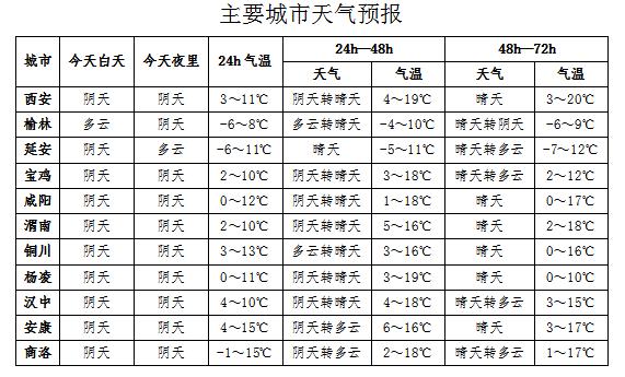 10日:陕北多云转晴天,关中、陕南阴天转晴天。11日:全省晴天转阴天,陕北东部局地、汉中南部局地小雨转雨夹雪(0~1毫米)。12日:全省阴天。陕北大部、关中北部有小到中雪,局地大到暴雪;关中平原地区、陕南大部有雨夹雪或中到大雪,秦巴山区有中到大雪,局地暴雪。陕北、关中大部、商洛有5~6级偏北风,阵风可达7级以上。日平均气温全省大部下降6~8℃,秦岭山区和高海拔地区下降8~10℃。13日:全省阴转晴,关中东南部、陕南东部有小雪或雨夹雪。陕北、关中东部有4~5级偏北风。日平均气温全省大部下降4~6℃,秦岭山区和高海拔地区下降6~8℃。14-16日:全省晴天间多云。17-18日:全省多云间晴天。后期天气趋势(12月19-22日):受冷空气和偏南风影响,全省大部以多云到阴天气为主,南部地区有一次弱降水天气过程。