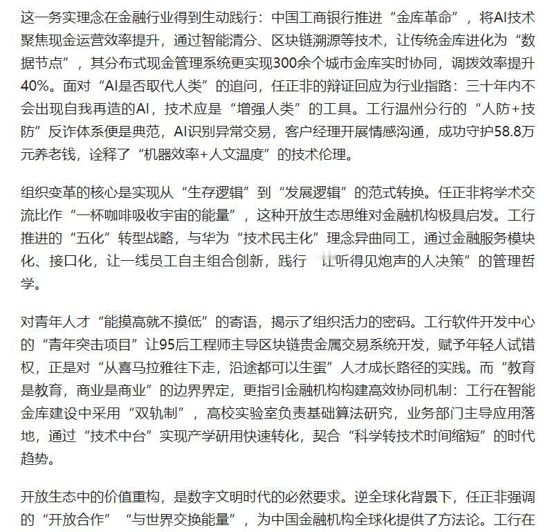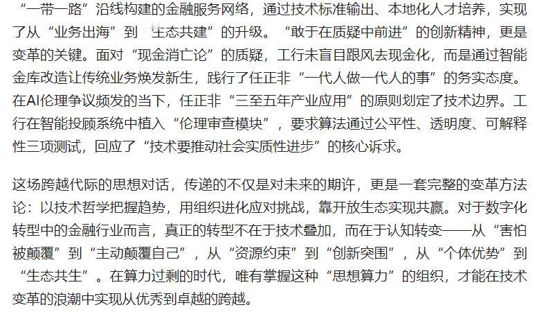 以奋斗者为本”的核心价值观,构建起适用于金融、科技等多领域的变革方法论,揭示了从“生存危机”到“发展机遇”的认知跃迁密码。 文章来自:评论员李炜《任正非反常识预言:未来愁的是算力过剩》