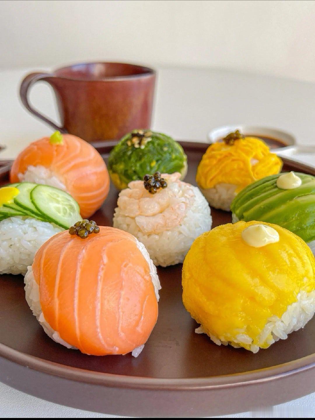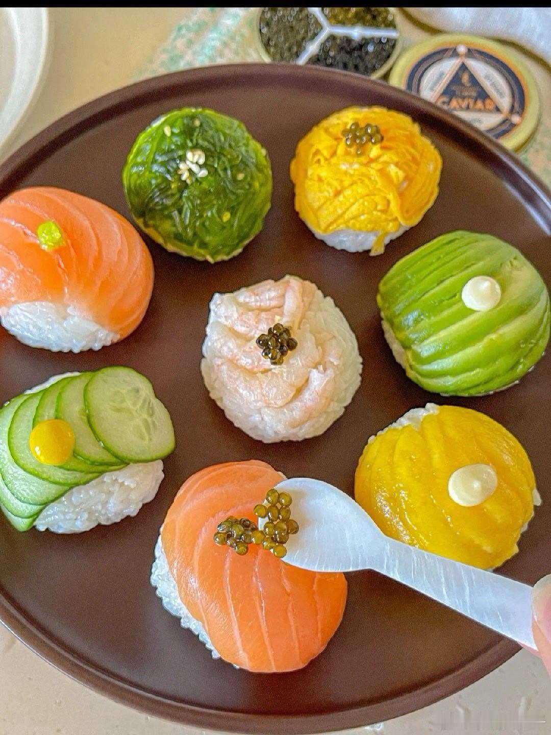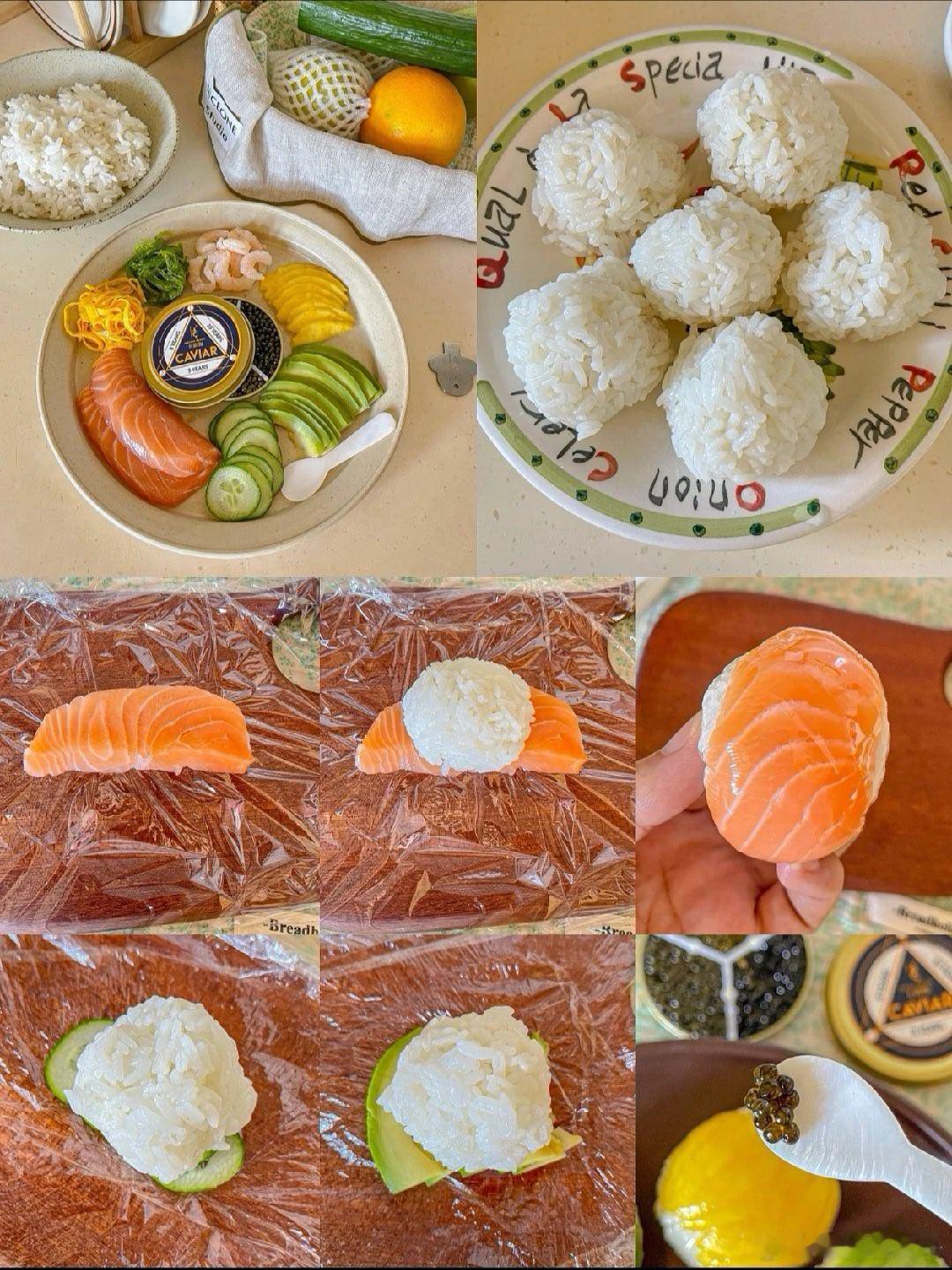 手鞠寿司!俺心心念念很久了~第一次做~一口一个贼满足食材:🍣米饭➕鱼子酱➕三文鱼➕鸡蛋丝➕黄瓜片➕甜虾➕芒果➕牛油果➕海草做法:👩🏻🍳1.米饭加一点寿司醋搅拌均匀 团成一般大小的饭球2.铺一张保鲜膜 依次放上食材➕饭团 包紧再摊开就OK啦3.同样的方法做好后装盘 按个人口味放上鱼子酱、蛋黄酱、芥末酱、黄芥末酱、熟芝麻…即可可可爱爱的一盘 做完后端给朋友看 还以为我叫的外卖 哈哈哈 小小成就感 !组个冬日养生局温暖的食光兴趣稀引力计划我的美食日记
