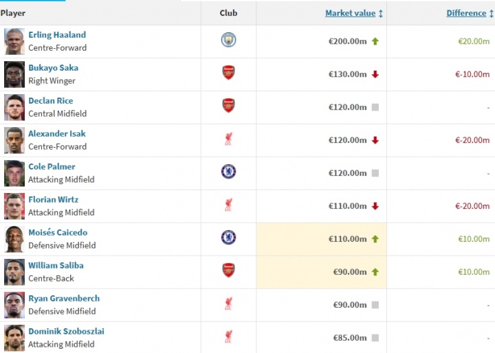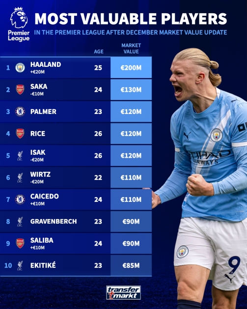 最新英超身价前十:哈兰德2亿,伊萨克降至1.2亿 维尔茨降至1.1亿
