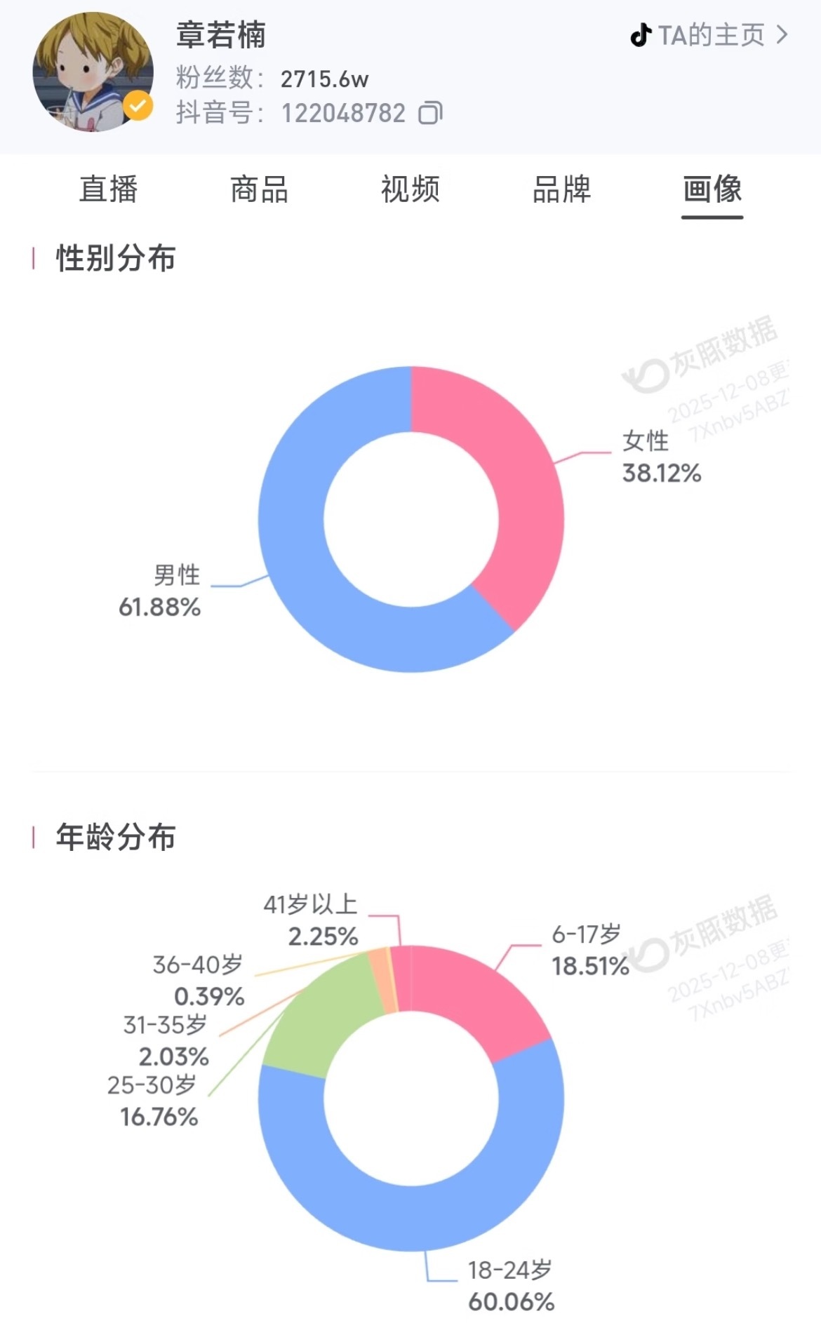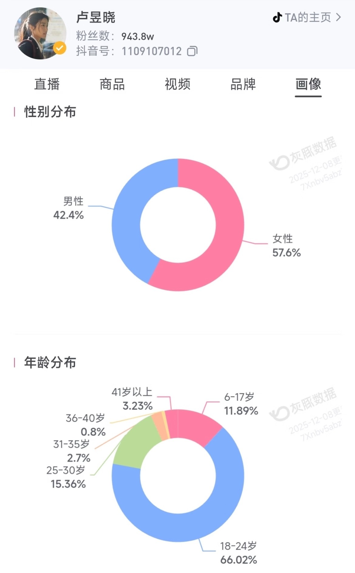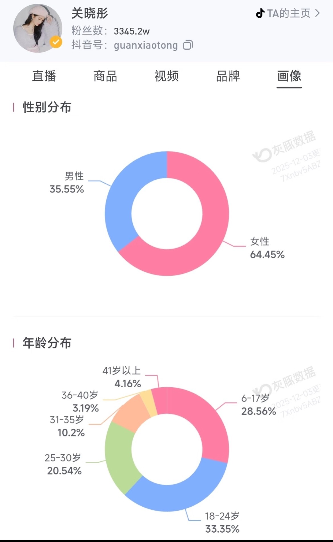 部分女明星的🫘粉丝 性别分布和年龄分布:赵露思 关晓彤 章若楠 虞书欣 卢昱晓