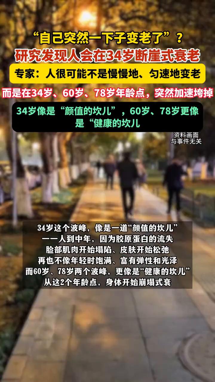"自己突然一下子变老了"?研究发现人会在34岁断崖式衰老。 专家:人很可能不是慢慢地、匀速地变老,而是在34岁、60岁、78岁年龄点突然加速垮掉。34岁像是"颜值的坎儿",60岁、78岁更像是"健康的坎儿"。 据生命时报报道,在20多岁时,即使天天熬夜、三餐不规律,但皮肤还是紧致的、细纹和白发还不太明显,像一颗保养得当的苹果。而过了某个年龄点,比如30多岁,即使已经注意养生了,但人还是跟泄了气的皮球似的迅速变得干瘪和苍老,身体各方面都感觉大不如前。在某个年龄后感到"老得更快",这不是你的错觉。 来自美国斯坦福大学的团队发表在《Nature Medicine》的一篇论文指出,人很可能不是慢慢地、匀速地变老,而是在34岁、60岁、78岁年龄点突然加速垮掉。 研究人员发现,在34岁时细胞外基质(ECM)相关的蛋白质大量减少,而ECM的代表之一就是我们熟悉的胶原蛋白。34岁的这一变化将对整个人生都影响明显。34岁这个波峰像是一道"颜值的坎儿"。人到中年,因为胶原蛋白的流失,脸部肌肉开始塌陷、皮肤开始松弛,再也不像年轻时饱满、富有弹性和光泽。而60岁、78岁两个波峰更像是"健康的坎儿"。从这2个年龄点,身体开始崩塌式衰老。