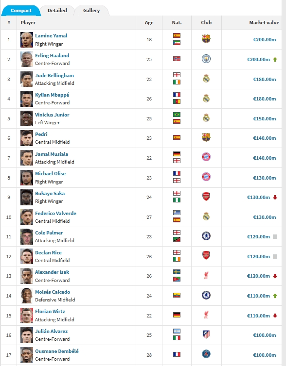 虎扑12月09日讯今日德转更新英超联赛球员身价。而目前,总共有17位球员身价上亿。