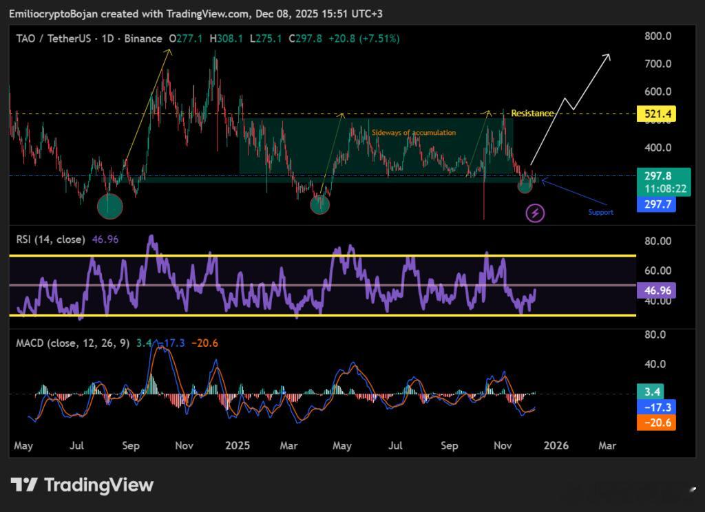 Bittensor(TAO )回到 300 美元附近稳住,市场情绪回暖,焦点是即将到来的首次减半。区块奖励将从 1 TAO 降到 0.5 TAO,每天新发行量减半,稀缺性提升。技术面看涨,TAO 正逼近 317—330 美元阻力,支撑稳在 276 美元。突破 330 后,短期目标可指向 360,进一步站稳 400—420 区域甚至冲击 520 美元。区块链币圈山寨币