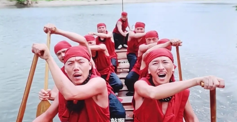几个划龙舟的人一齐说敲鼓啊!古老二才想起敲鼓,他这一敲鼓,划龙舟的人使劲往前划龙舟,古老二一下就趴在大鼓上了,那个表情太逗了。
