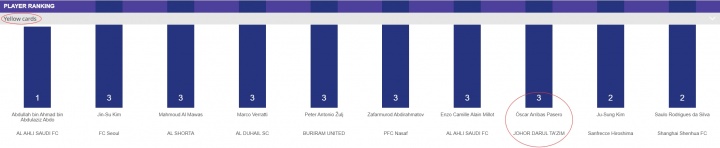 亚足联官网显示,阿里巴分别在对阵武里南联、上海申花和墨尔本城时吃到黄牌,亚足联官网也显示他已经吃到了三张黄牌。