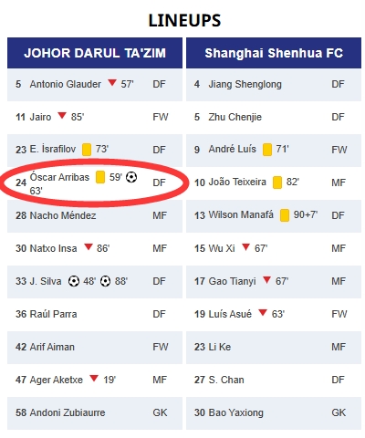 直播吧12月09日讯亚冠精英联赛第6轮,上海海港客场对阵柔佛新山。柔佛新山的24号球员奥斯卡·阿里巴斯在亚足联官网上的数据显示上一轮比赛吃到第三张黄牌,按规则应该停赛,但他本场依然首发。