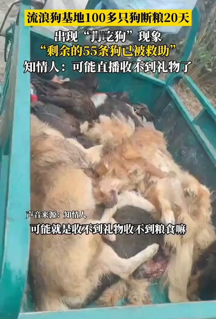 流浪狗基地100多只狗断粮20天,出现"狗吃狗"现象。 知情人:可能直播收不到礼物了。 近日,安徽一流浪狗基地因粮食"不到位",100多条狗饿了20多天。 知情人透露:这些狗圈养了三年,之前的捐款也买了狗粮,但后面不知道怎么变成这样了。 这个流浪狗救助中心有100多条狗,后来她直播可能就是收不到礼物、收不到粮食,狗就关起来了,20来天没喂,然后就狗吃狗。