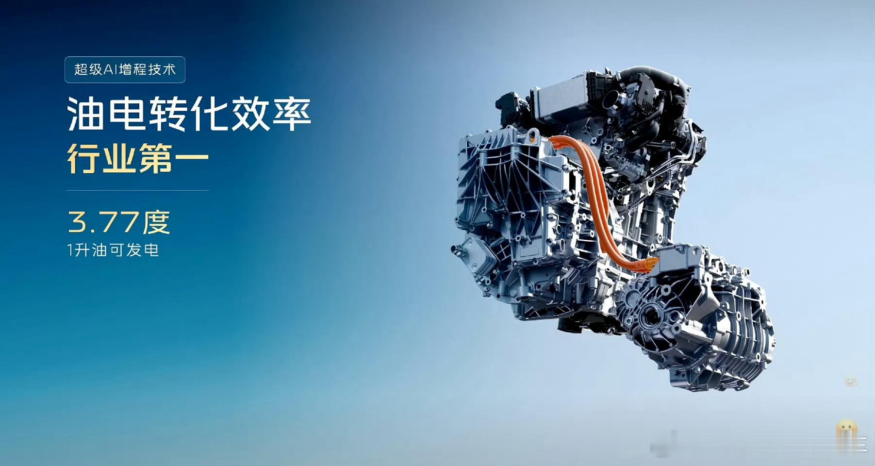 一升油发3.77度电!这是吉利银河V900的增程器的油电转换率。不知道这个数字是实验室工况,还是量产车工况?如果是量产车工况,那就是目前的业内第一了。现在主流增程车,1升油大概能发3.0-3.5度电,此前的纪录保持者中,昊铂HL增程器为3.73度/升,星途星纪元增程器为3.7度/升。目前,吉利银河这套增程器系统刷新了纪录。银河这套系统,采用了90kW峰值功率的发电机,比市面上多数增程车60-80kW的发电机功率都高。不知道这是不是油电转化效率高的原因。另外我一直有一个疑问,厂家公布的油电转化效率,一升油指的是92号汽油还是95号汽油?以后车企能不能也顺带公布一下汽油的标号。这样对比才更清晰。