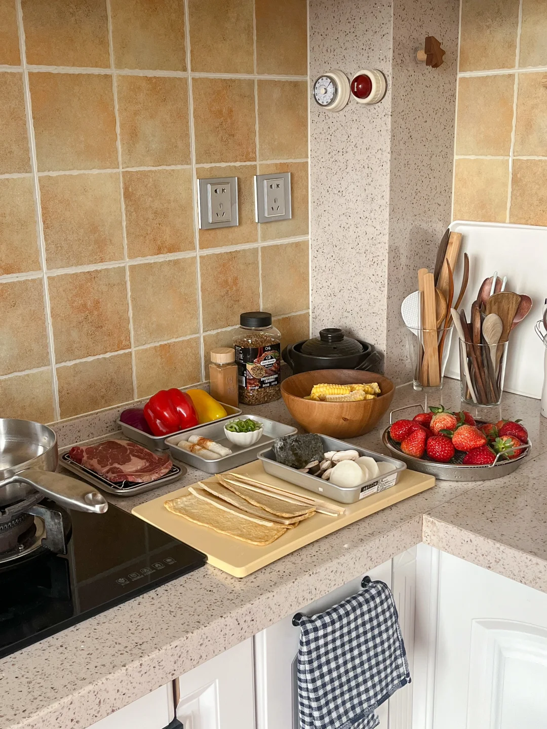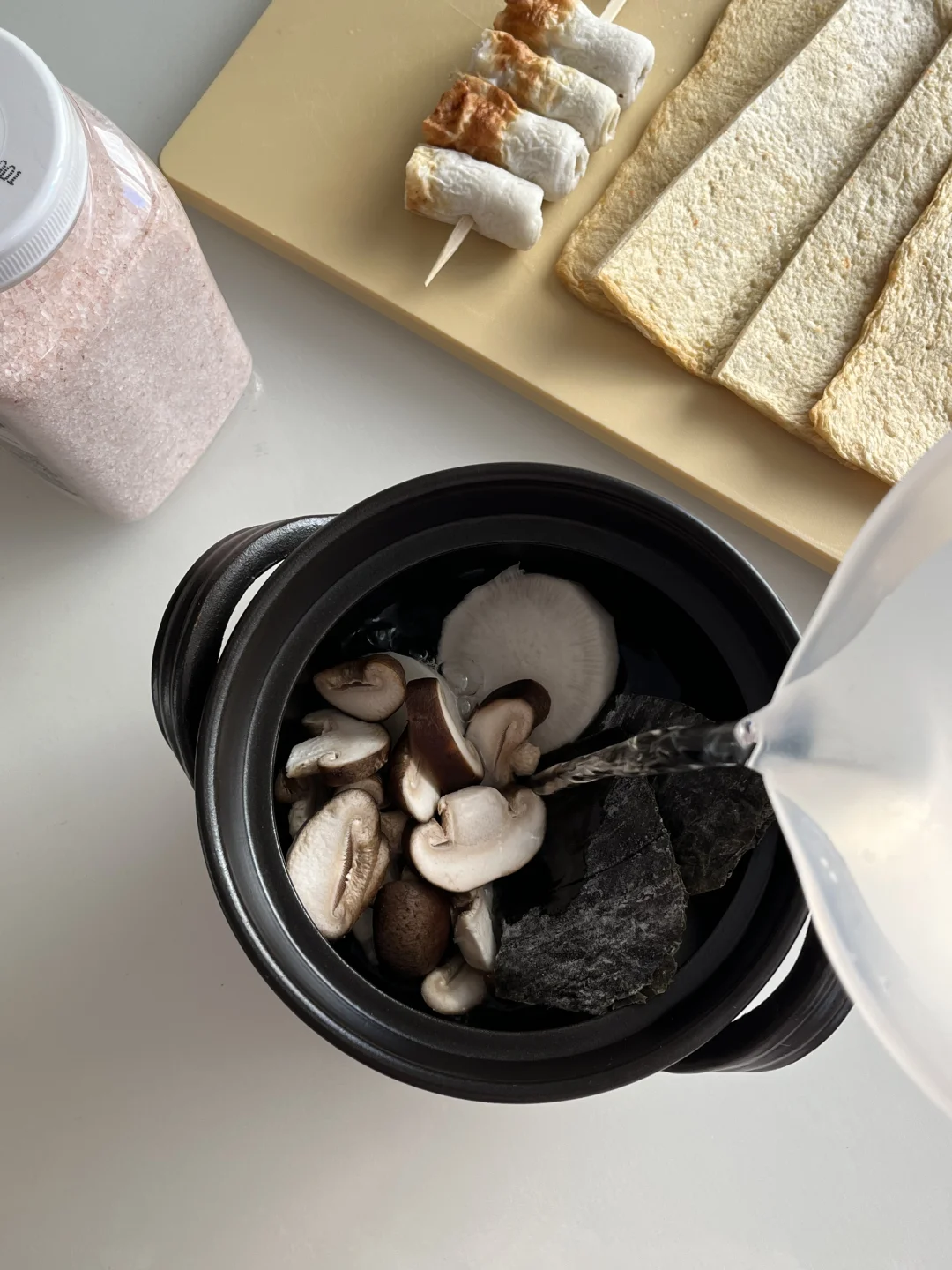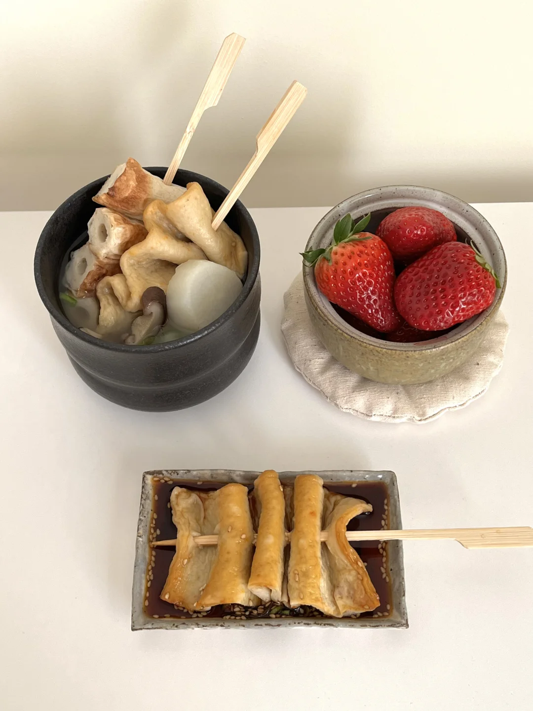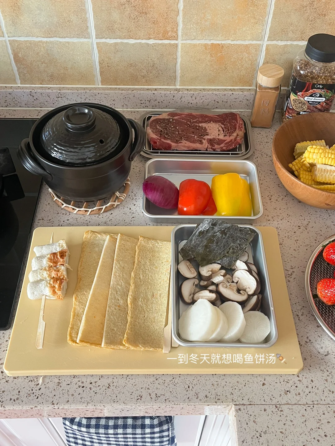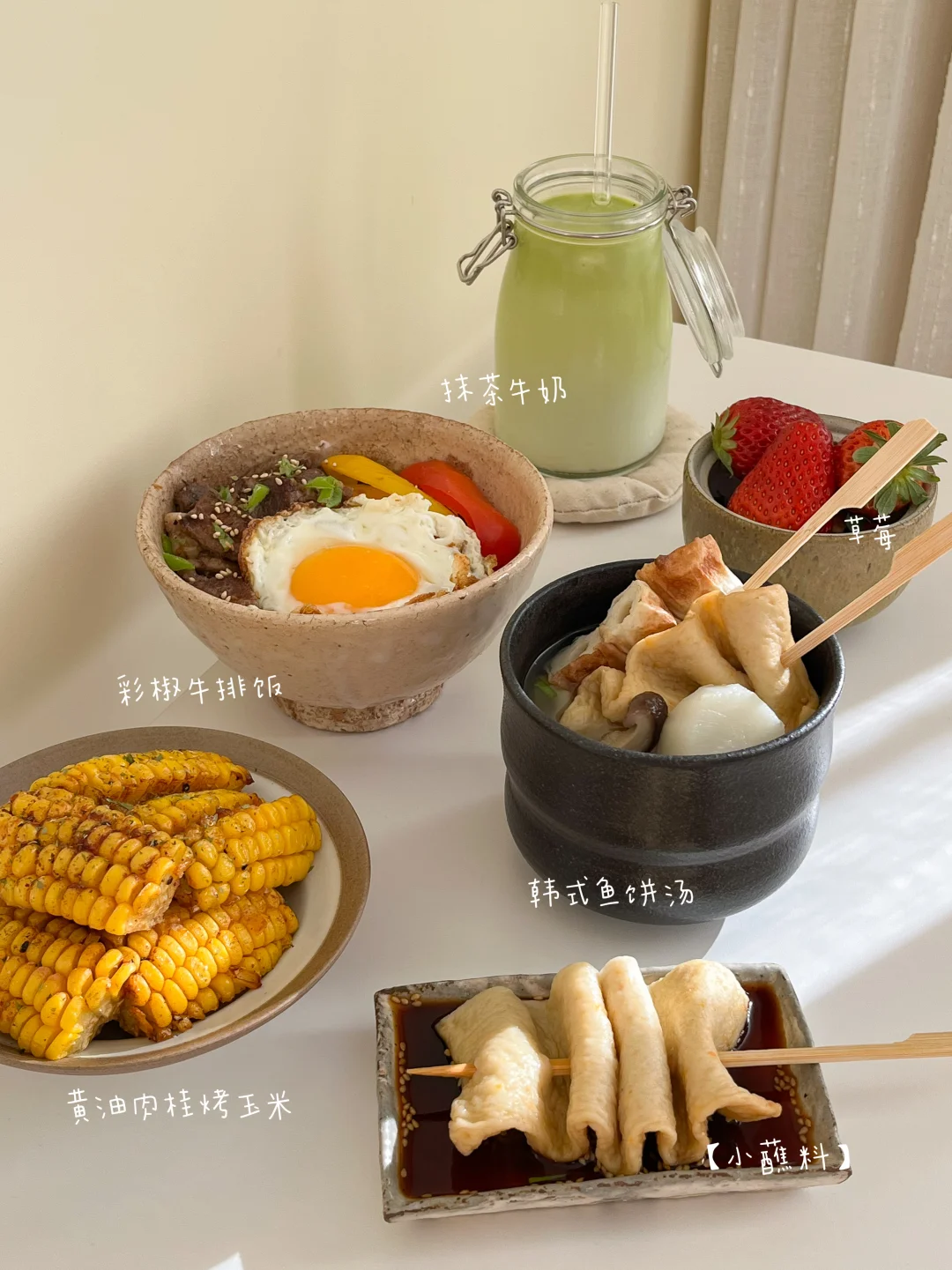 今天的饭: 彩椒牛排饭🍳 黄油蜂蜜肉桂烤玉米🧈 韩式鱼饼汤🍢 抹茶牛奶🍨 ▪️ 韩式鱼饼汤 冬天这么冷 就得喝点热乎乎的鱼饼汤啊 昆布和白萝卜煮汤底 有木鱼花也可以放一把 咕嘟10分钟 鱼饼要煮软了再穿成串 白萝卜吸收了鱼饼的味道 汤底都很鲜甜 ▪️ 黄油蜂蜜肉桂烤玉米 一直吃咸辣味的烤玉米 今天换个口味 试试甜甜的黄油蜂蜜肉桂味儿 海盐+黄油+蜂蜜+肉桂粉+黑胡椒碎 空气炸锅160度烤15分钟 烤出香味儿
