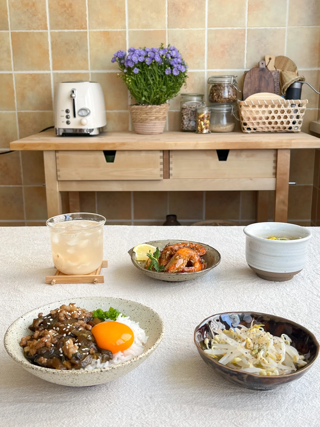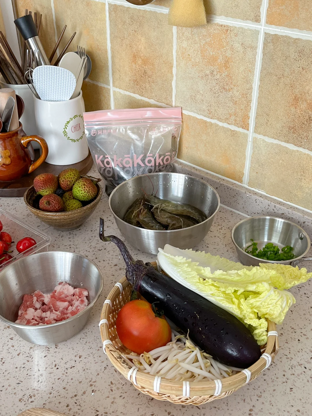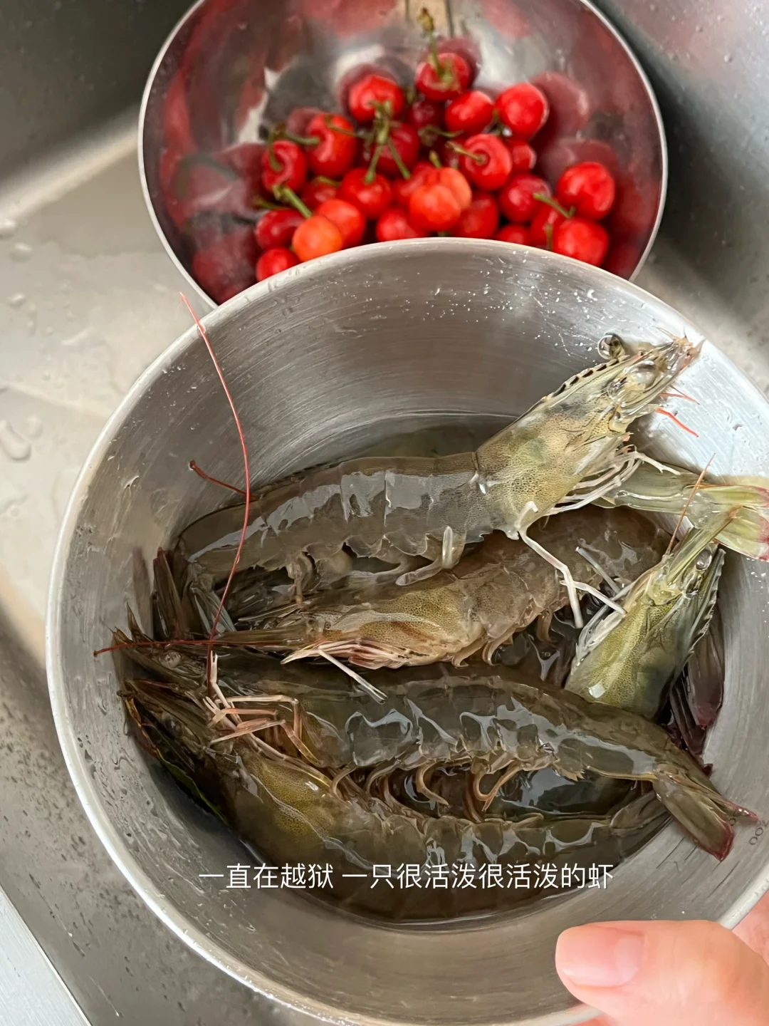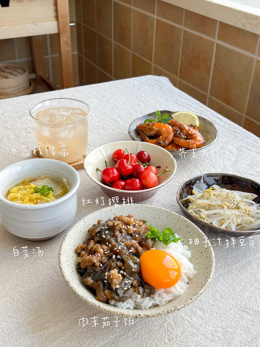 今日午餐: 肉末茄子饭🍆 柚子汁拌豆芽🌱 芥末大虾🦐 白菜汤🥣 冰荔枝绿茶🍵 红灯樱桃🍒 今天下雨 早市人很少 所以买到了很新鲜的虾 我备菜的时候有只虾一直在蹦跶 试图越狱逃跑 买了一斤活虾 吃一半 另一半就放保鲜袋里冻着 做了一道芥末大虾 巨巨巨巨好吃 我用的山葵酱 不辣也不呛鼻 是淡淡的清香味 可以多放一点 加生抽、白糖、味淋和盐 调酱汁 撒点淀粉 把虾壳煎的脆脆的 出国前再放块黄油 蒜末和芥末混在一起 真的太好吃了