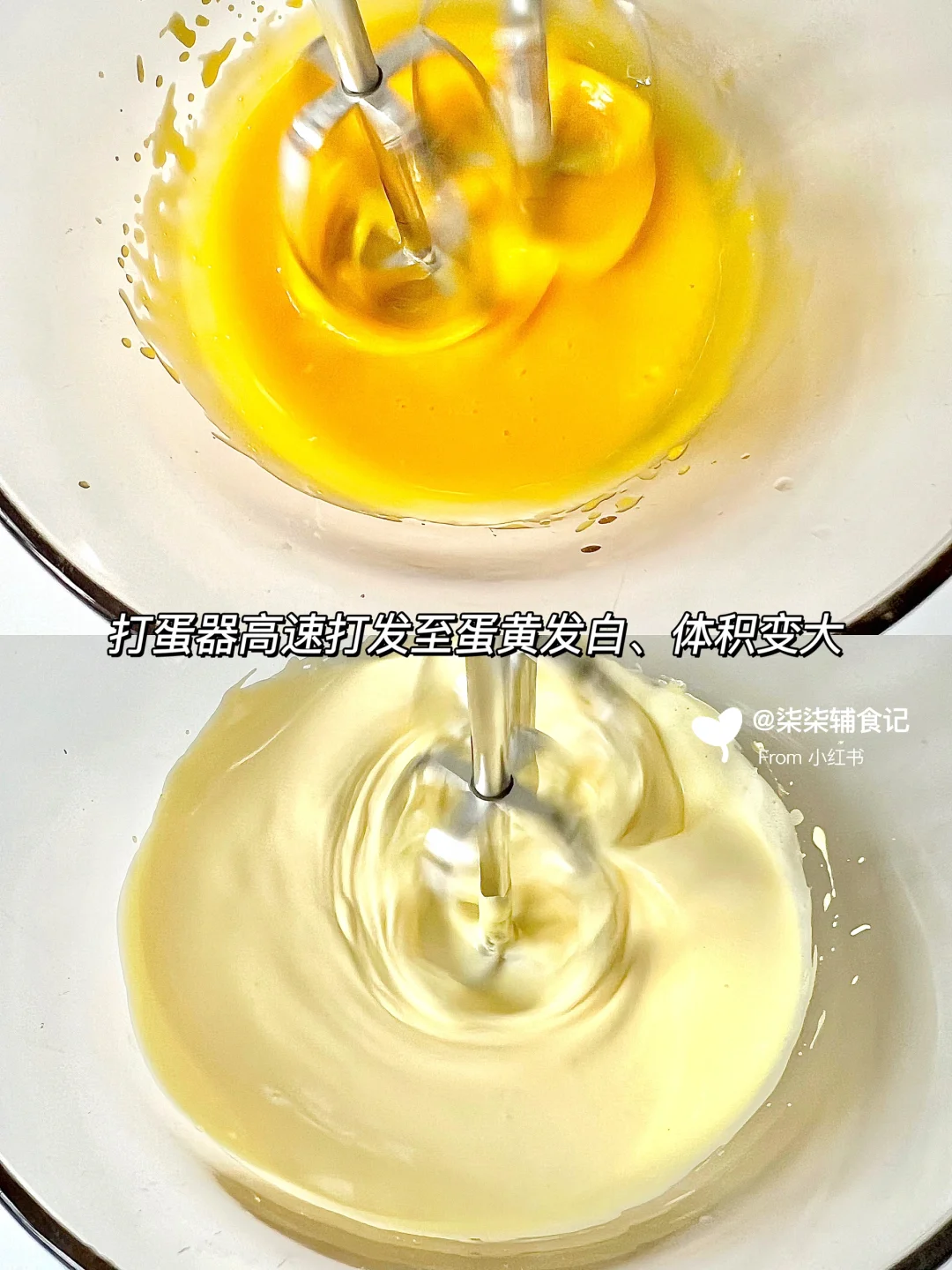 ▫️打蛋器高速打发至蛋黄发白,体积变大,打完提起来写八字不易消失的状态就ok