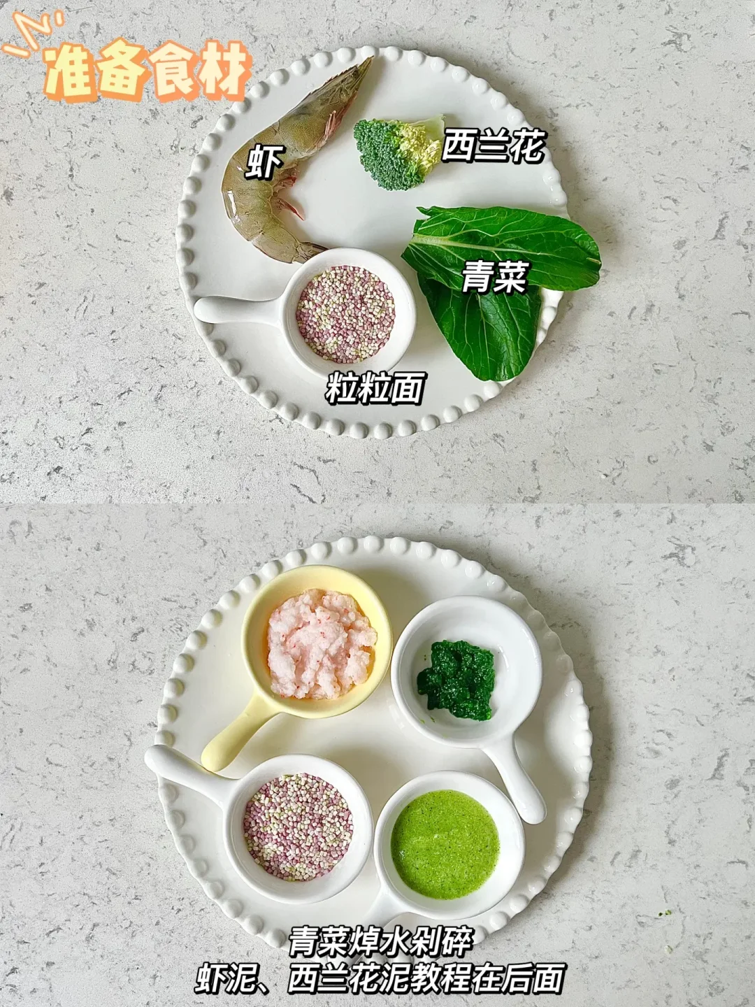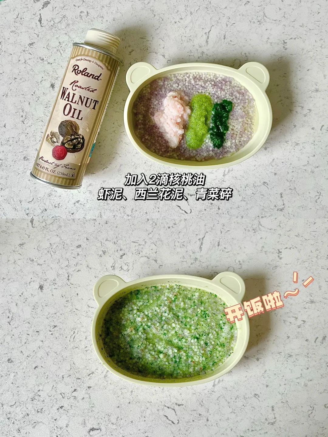 🥣:粒粒面➕核桃油➕鲜虾泥➕蔬菜泥➕西兰花泥