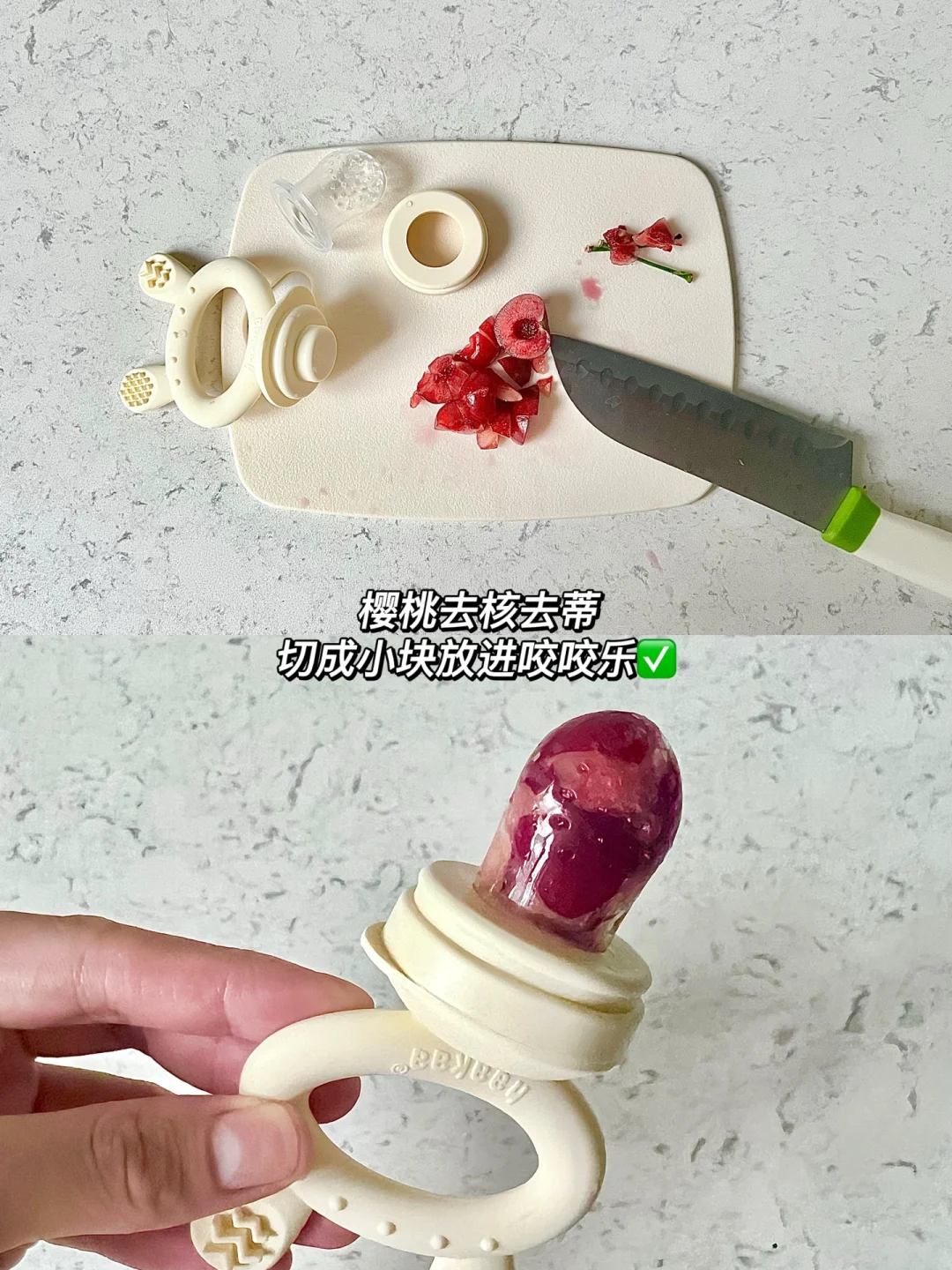 吃完喝了50ml水,吃完没多久就睡午觉了,睡的比较久,隔了三个小时才喝奶,下午加餐樱桃🍒咬咬乐[害羞R]。