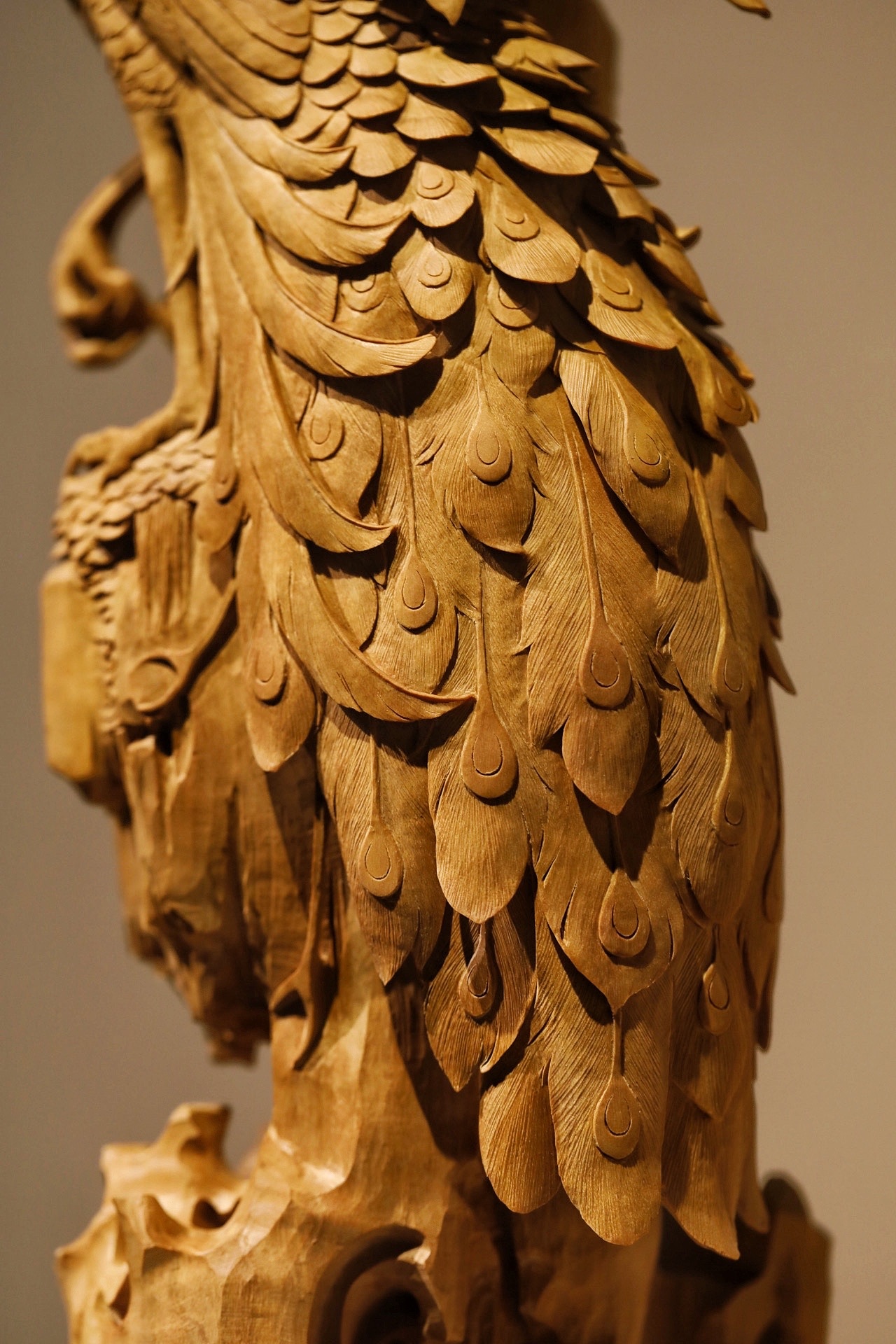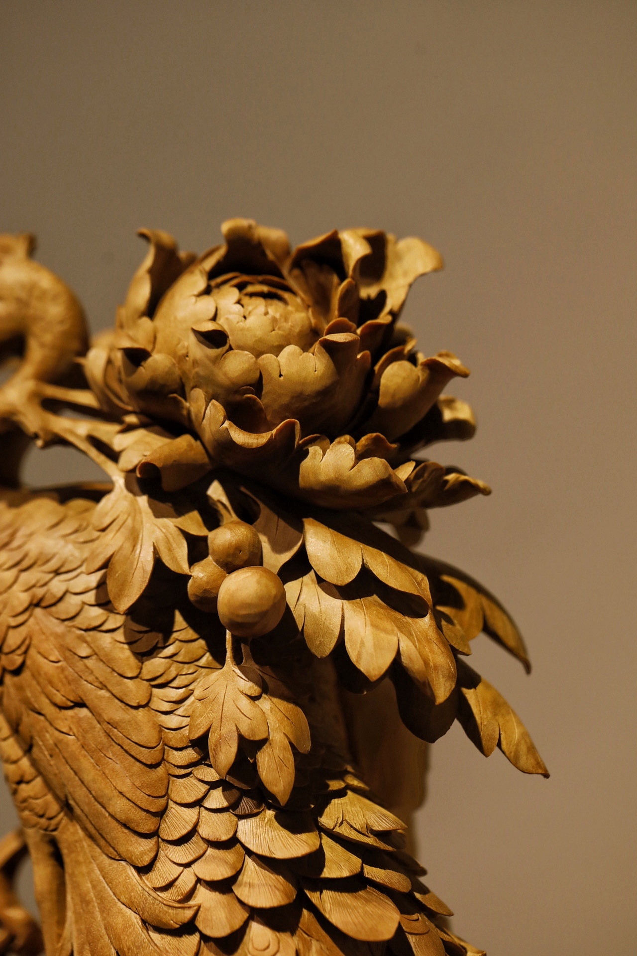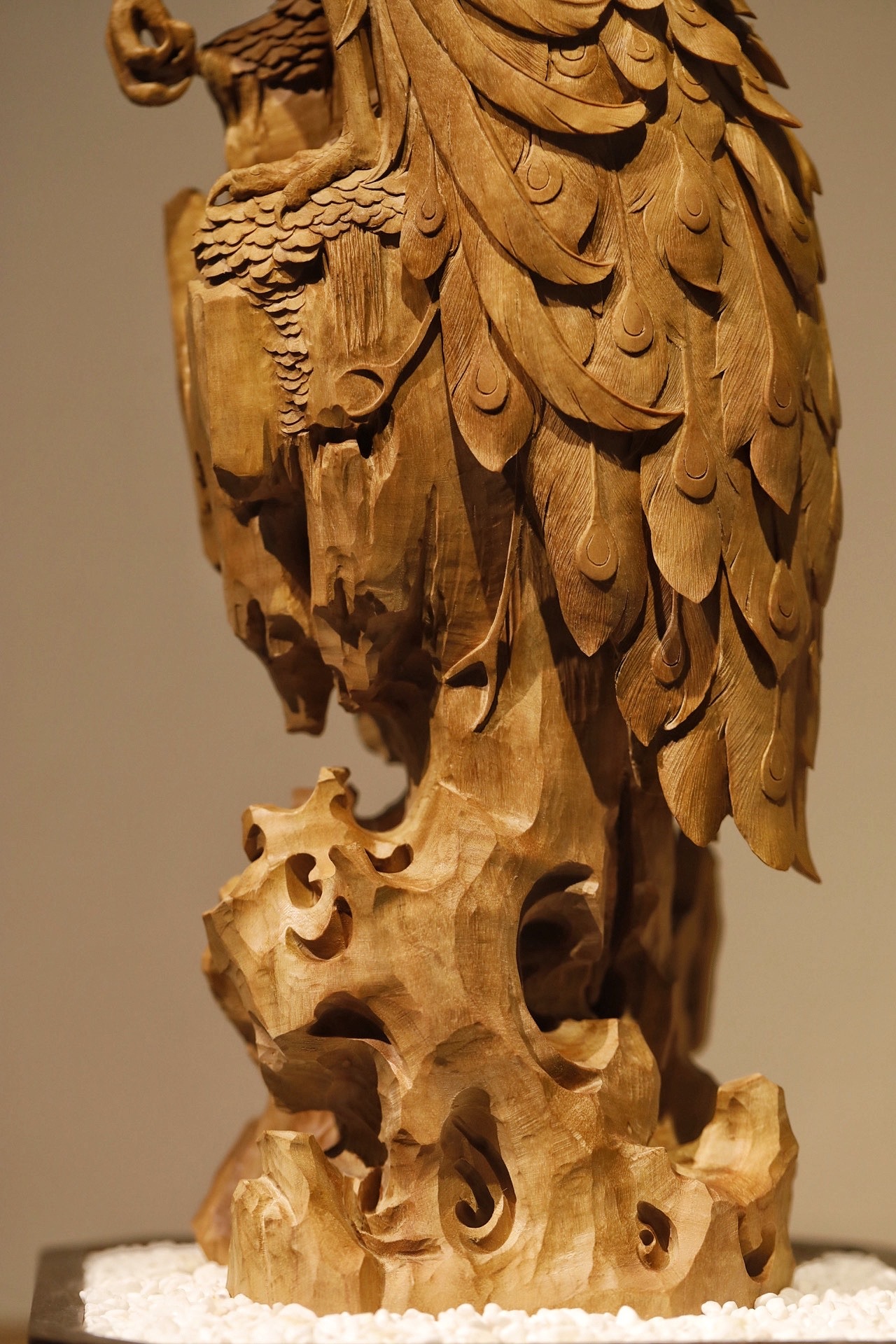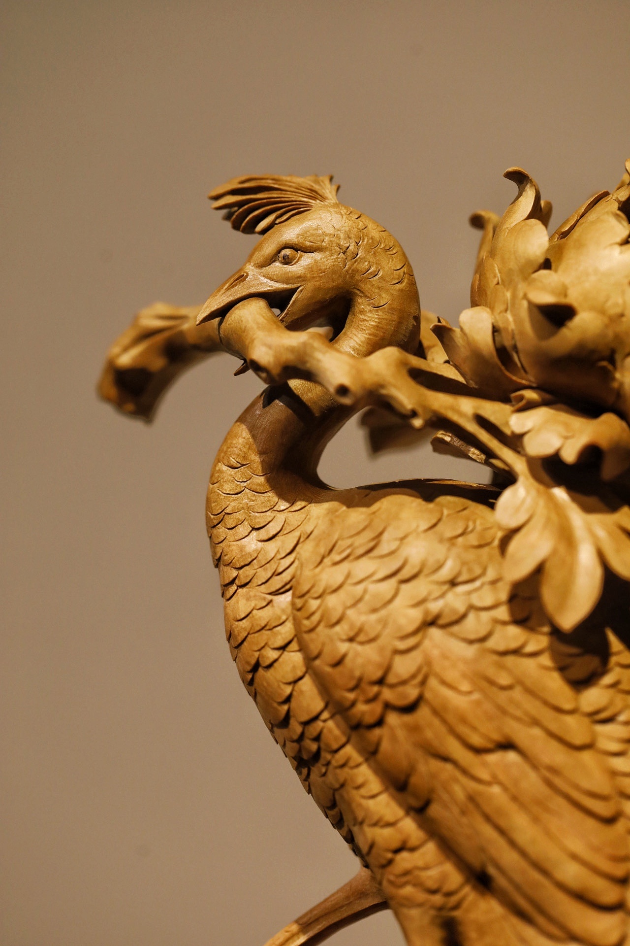 老山檀香|富贵吉祥·案摆檀香肌理凝润,整料雕孔雀立崖:孔雀首衔花枝,背拥牡丹团簇,尾羽如金缕铺展,每片翎眼都刻得灵动鲜活;牡丹瓣叠如锦,与雀羽缠出富贵相,崖基卷纹裹着吉意——雕的是孔雀栖春,藏的是“富贵随身”,檀香漫处,祥光暗生。整体规格:18×19×45cm重量3233g