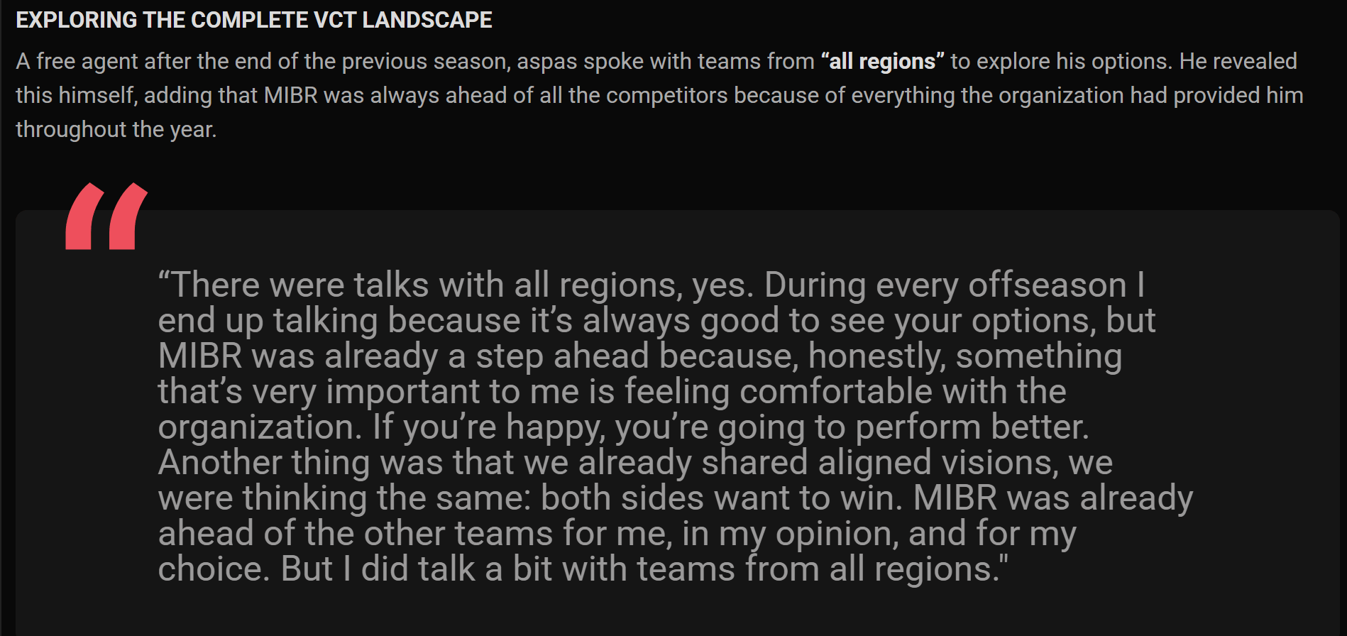 "是的,我跟所有赛区都谈过。每个休赛期,我都会聊一聊,因为多看看不同的选择总是没错的。但MIBR当时已经领先一步了,因为说实话,对我来说最重要的一点是要跟队伍相处得比较舒服。如果你人比较开心,那你的表现自然能更好。还有一点就是我们的愿景很契合,我们的想法一致——双方都想赢。在我看来,MIBR已经领先于其他队伍,也符合我的选择。不过,我确实跟所有赛区的队伍都聊过一下。"