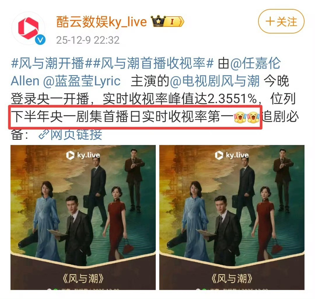 风与潮站内热度6014!4小时破6000!收视率是央1下半年首播第一!何贤角色热